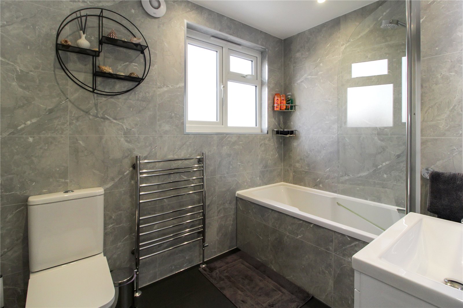 Modern fitted suite with bath and shower over, sink and WC, Tiled walls, lino to floor, smooth ceiling, spotlights to ceiling, vanity unit, double glazed obscure window to side.