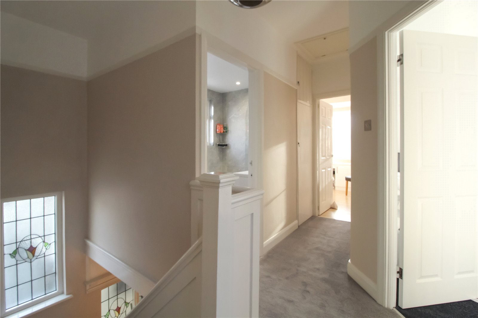 Carpet to floor, smooth ceiling, ceiling light, loft hatch, with fully boarded and insulated loft with power and lighting, double-glazed stained-glass window over stairs, doors to all first floor rooms.