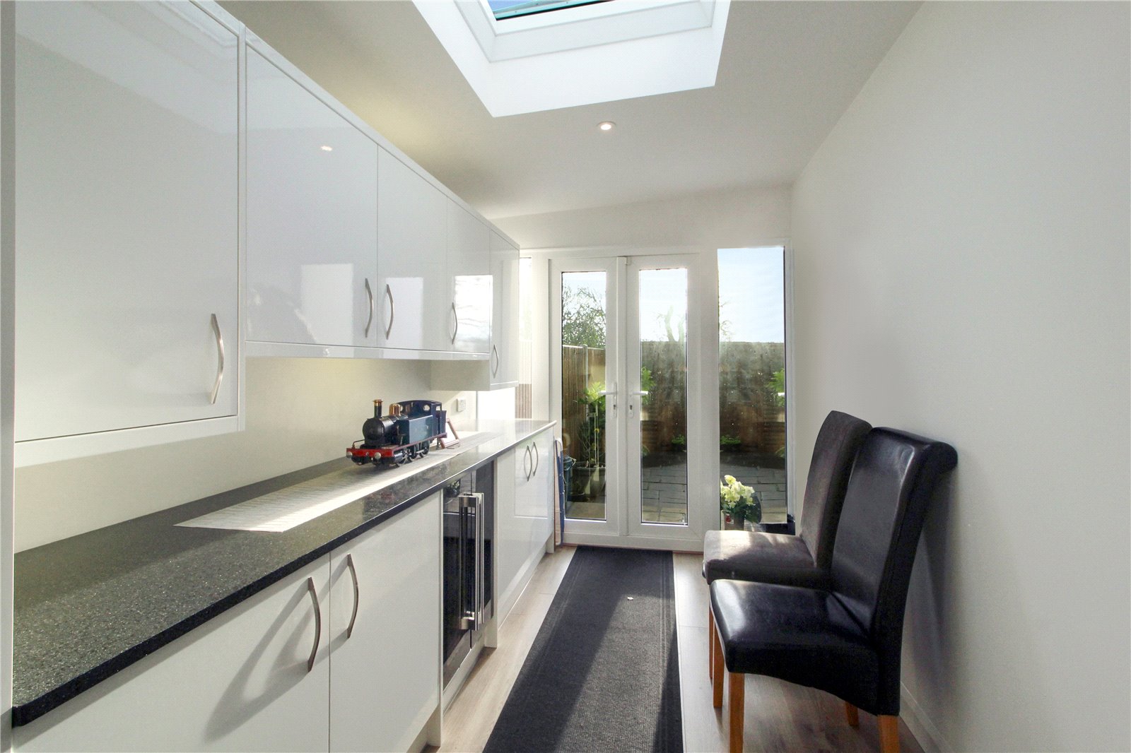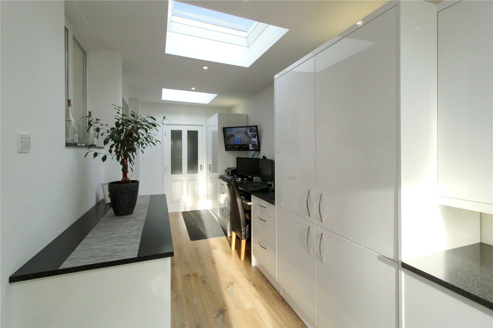Wood effect flooring, range of eye and base level units, built in wine cooler, space for washing machine and tumble dryer, 3 x skylights, double glazed door to rear garden, smooth ceiling, spotlights to ceiling, radiator, door into: