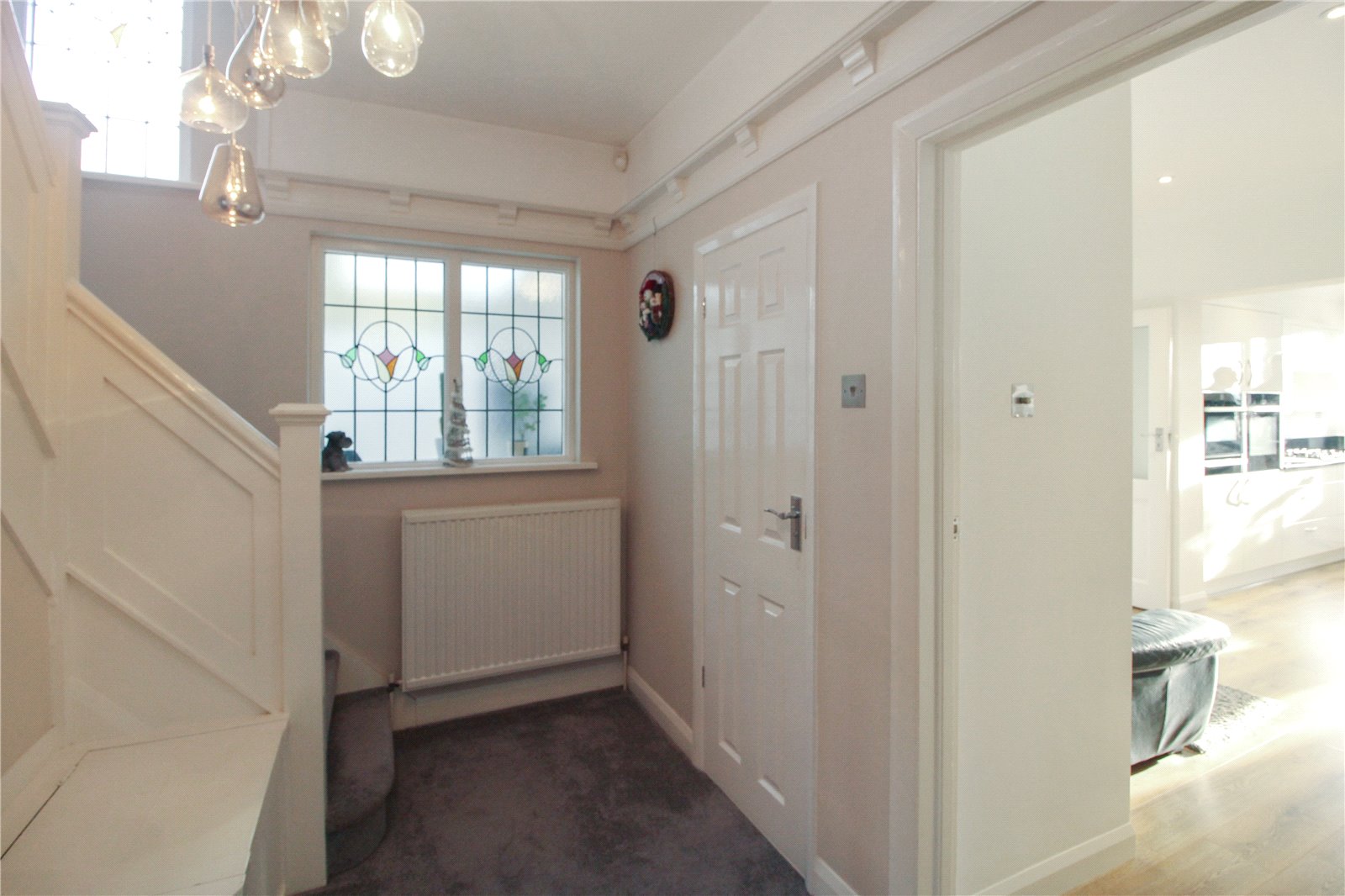 Carpet to floor, smoothing ceiling, ceiling light, radiator, under stairs storage cupboard, double glazed stained glass window to side, stairs to first floor and doors to all ground floor rooms.
