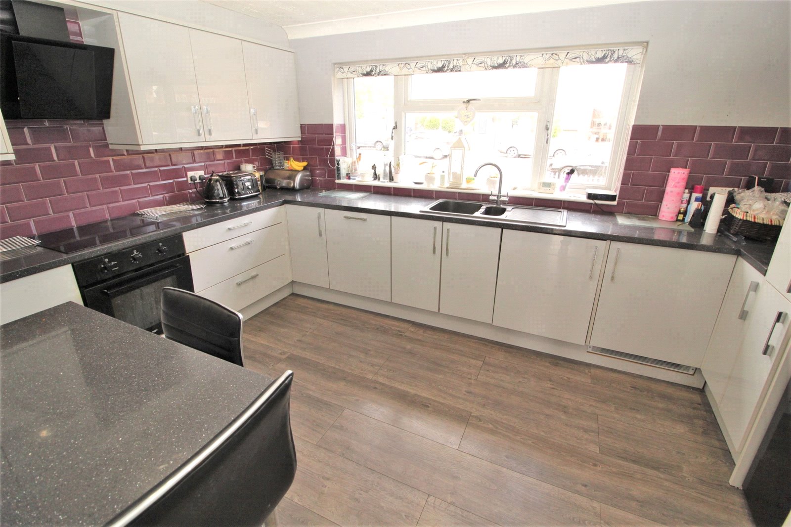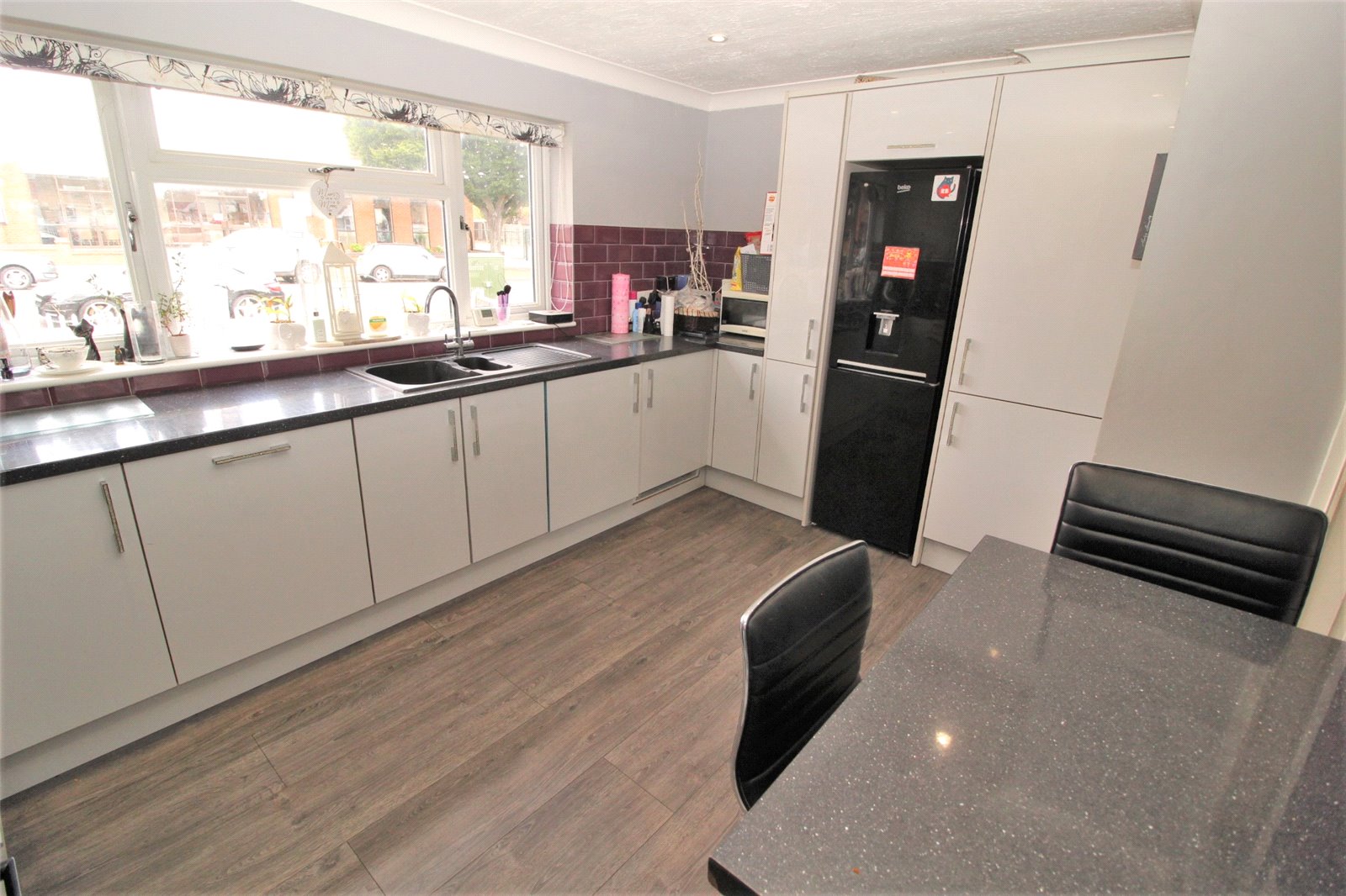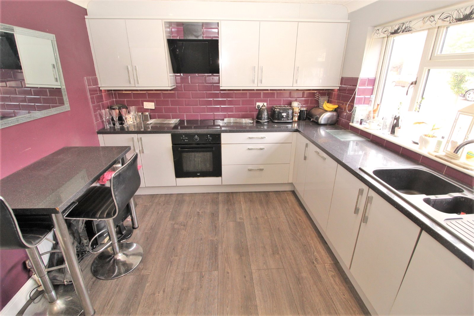 Upvc double glazed window to the front aspect. The kitchen is modern and fitted with a range of base units with roll edge work surfaces incorporating a one and a half bowl single drainer sink unit with mixer tap. Further matching wall mounted storage units. Integrated dishwasher, washing machine, oven and four ringed ceramic hob with extractor fan over. Space for fridge/freezer. Cupboard housing wall mounted central heating boiler. Part tiling to walls. Coved cornicing with textured ceiling and inset spot lighting. Breakfast bar. Single banked radiator. Laminate wood effect flooring.