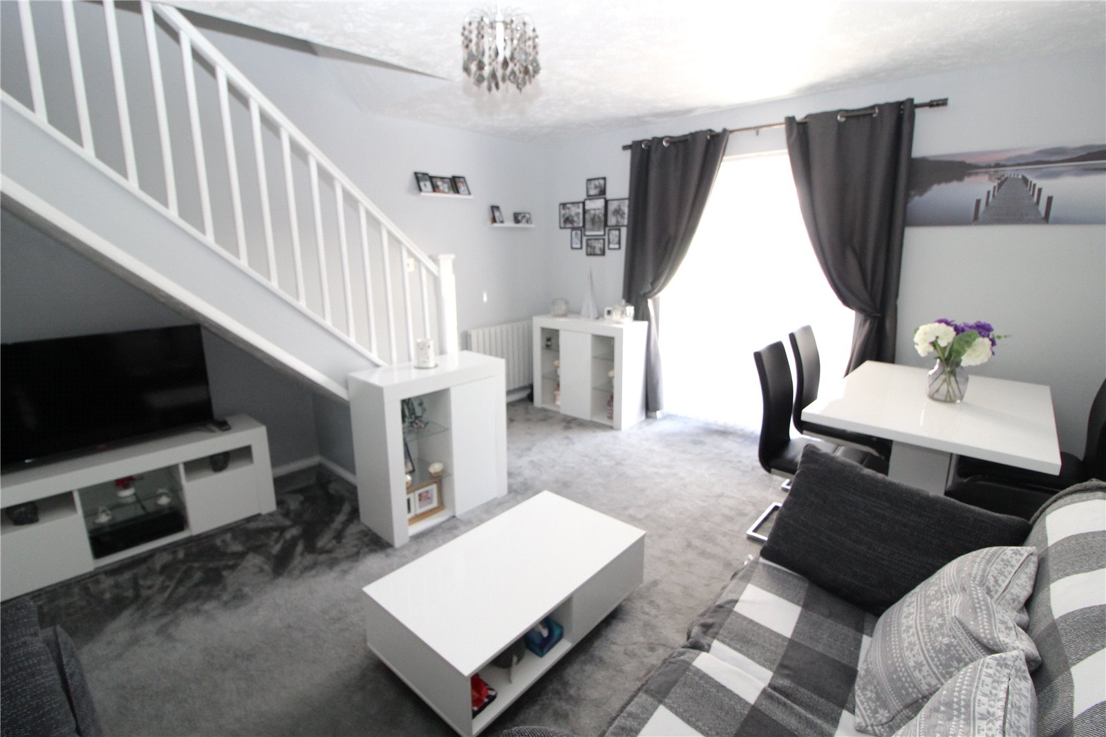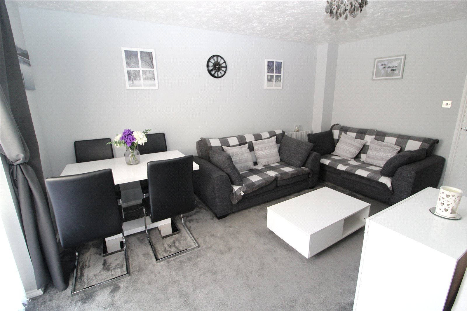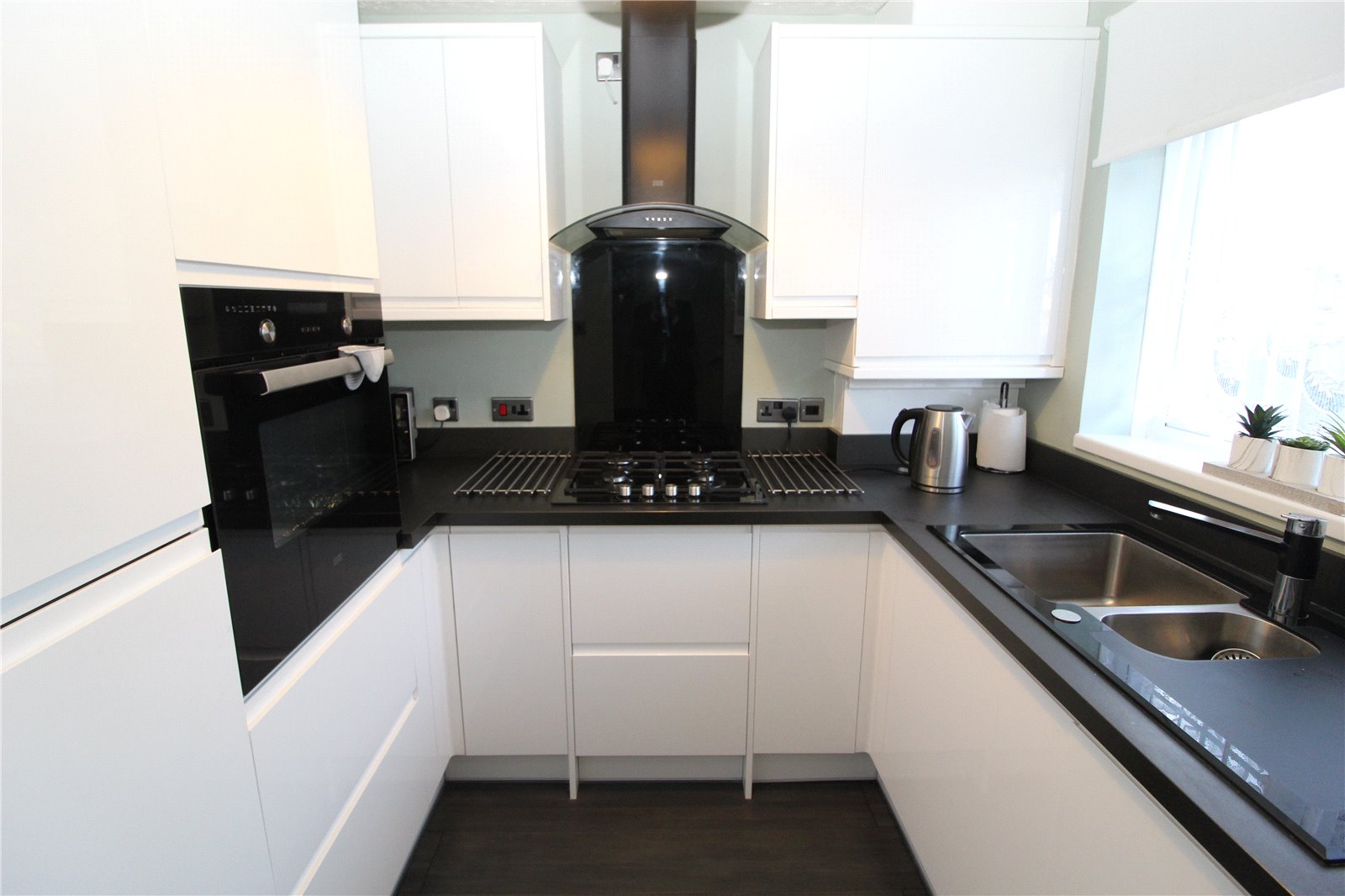 Double glazed window to front aspect, range of dark granite effect square edge work tops with matching upstands, inset sink and drainer, inset four ring gas hob, with splash back panel and extractor hood over. White high gloss base cupboard and drawer units with matching wall units over. fitted oven, integrated washer/dryer, matching cupboard housing the boiler, integrated fridge/freezer, dark grey wood effect laminate flooring.