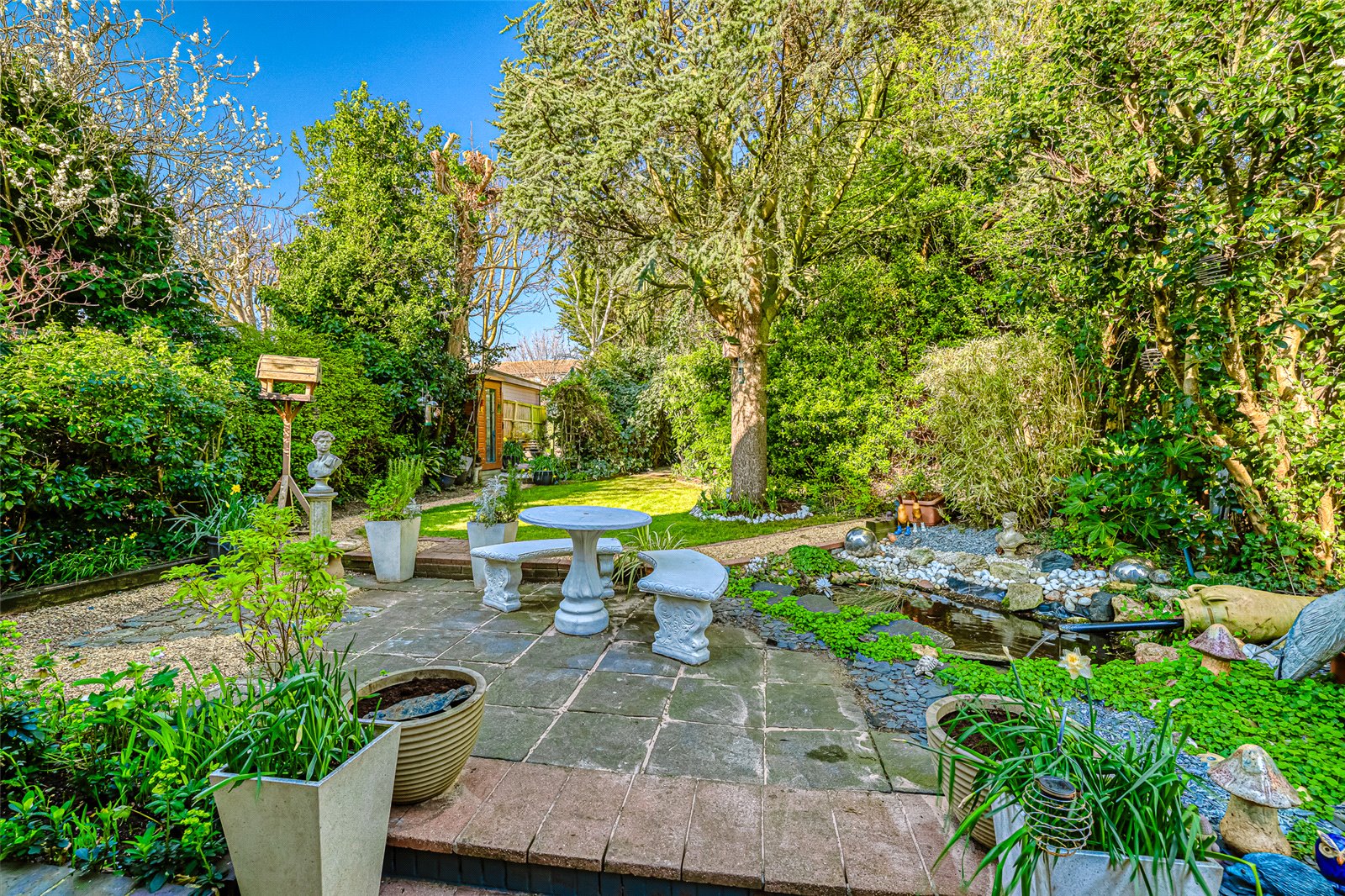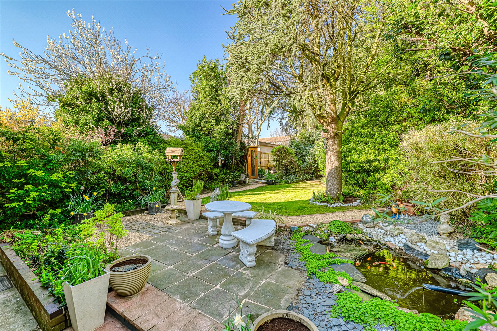 A beautiful, landscaped rear garden, commencing with a paved area, with steps up to a lawned garden, separated in sections throughout with various shrubs and trees. Fishpond, 2 x sheds, summerhouse.
