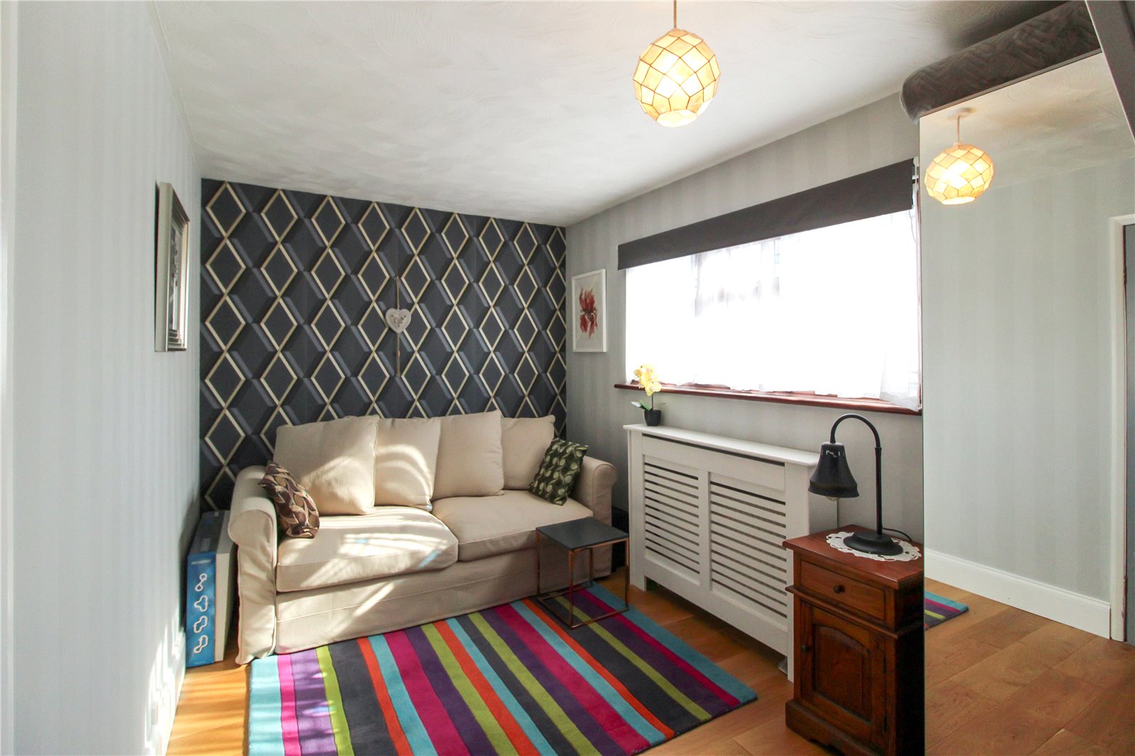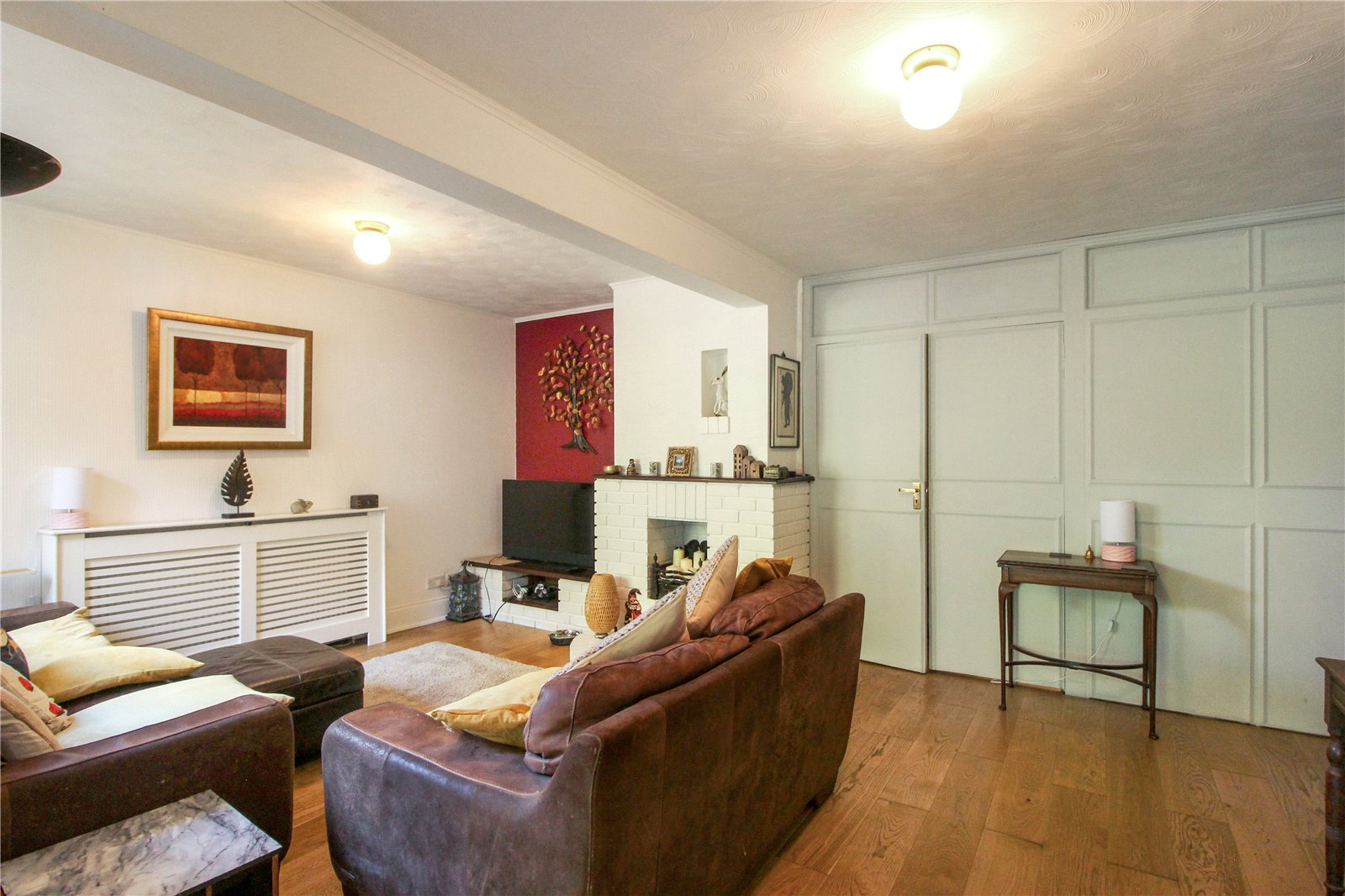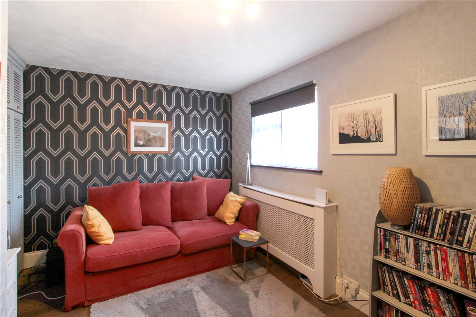 Double glazed bay window to front, wooden floor, smooth ceiling, ceiling light, radiator, built in storage unit / book shelves.