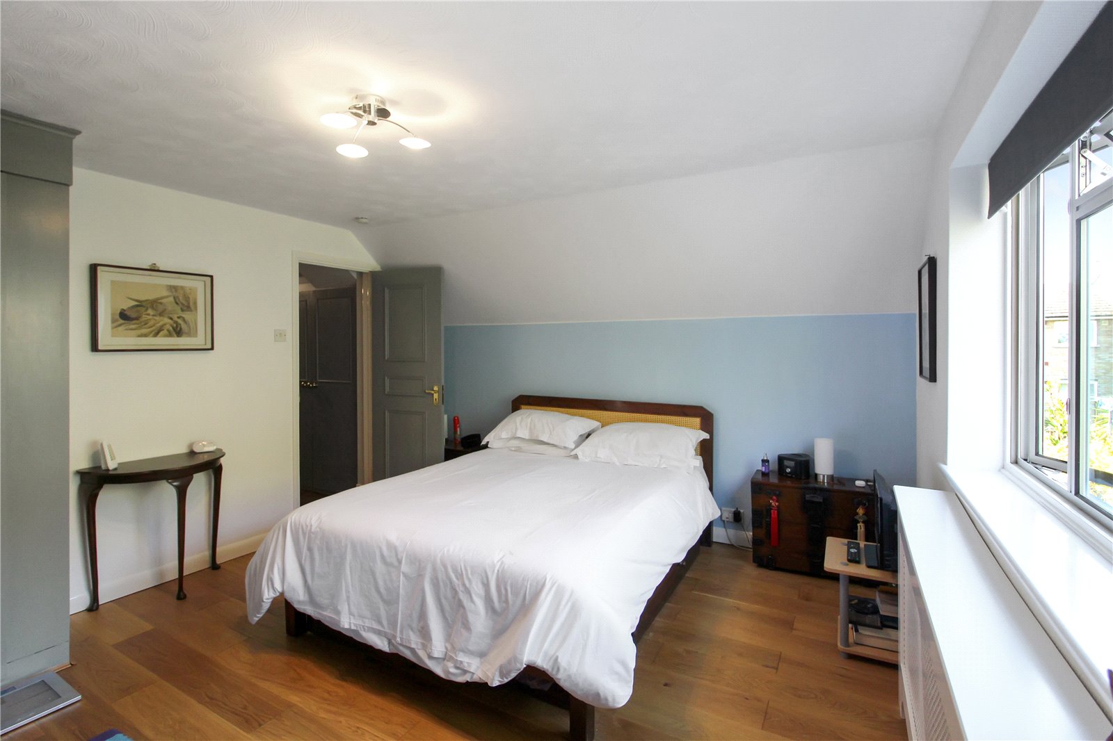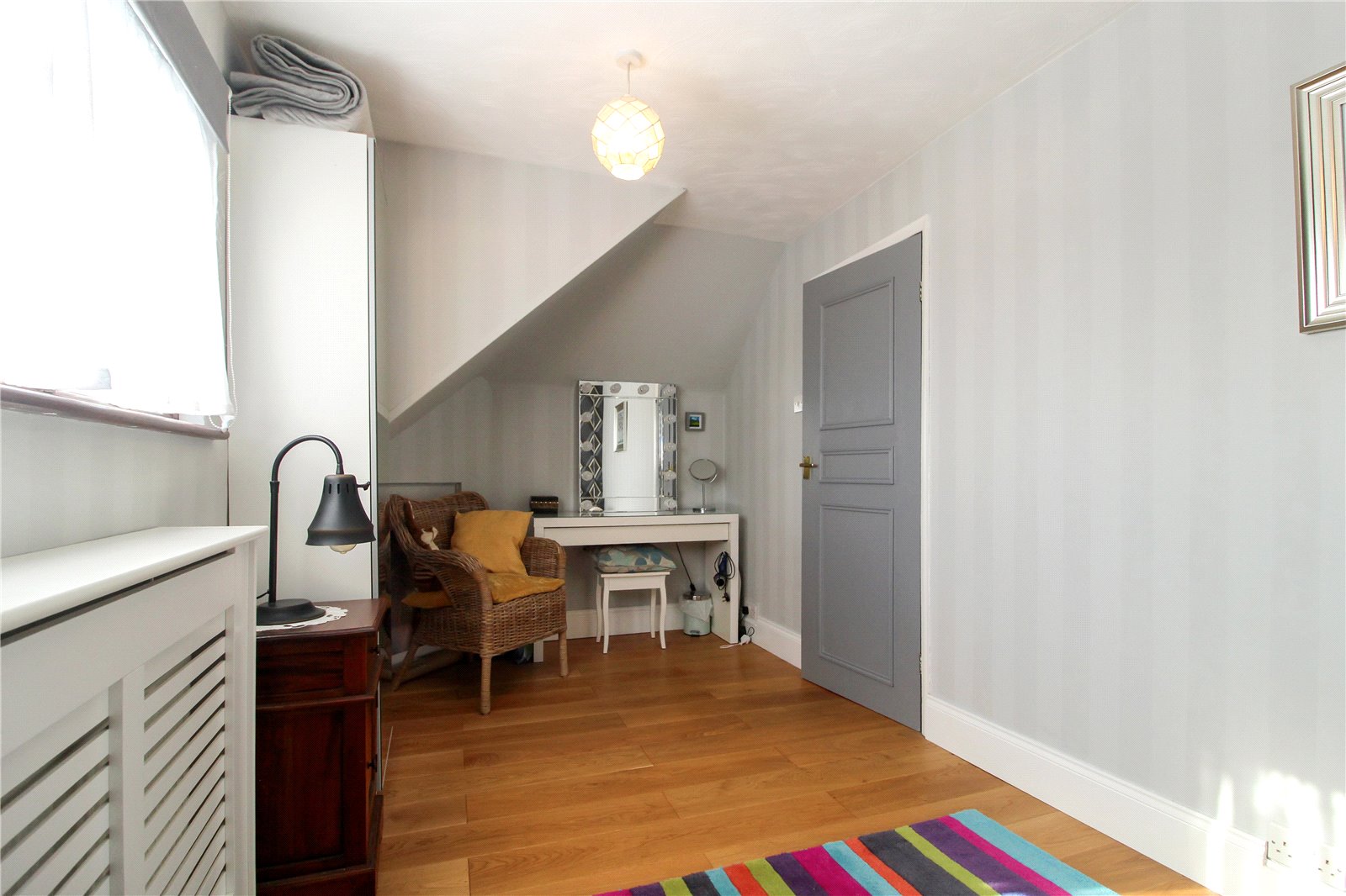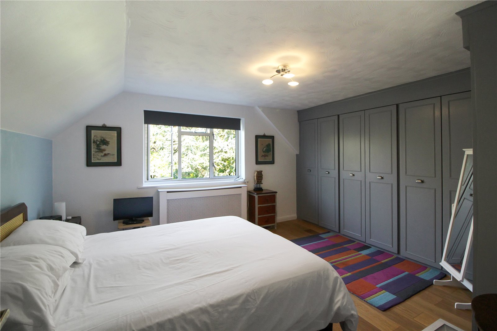 Large and bright room, with wooden floor, fitted wardrobes to one wall, radiator, ceiling light.