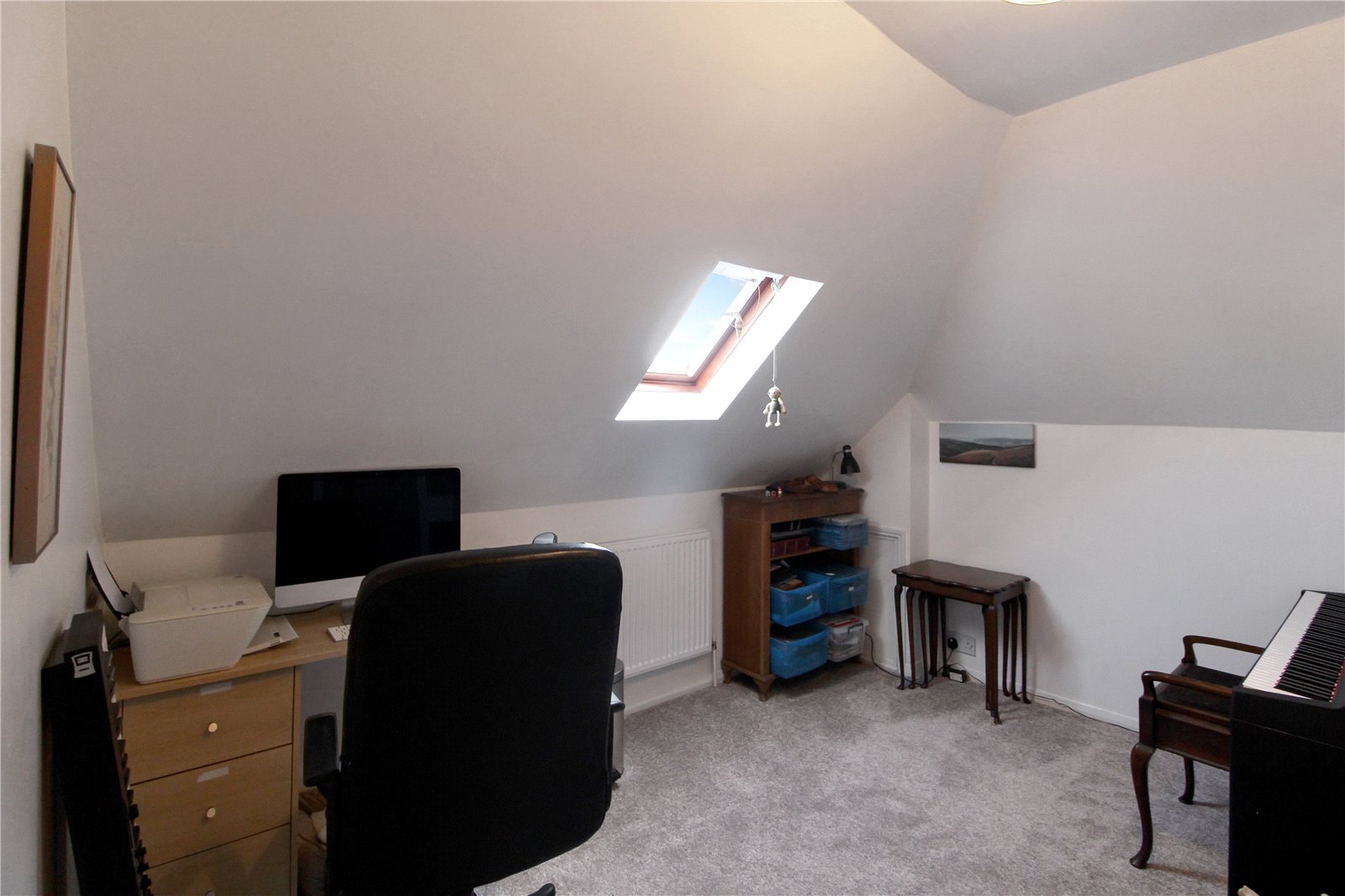 Carpet to floor, ceiling light, radiator, velux window to front.