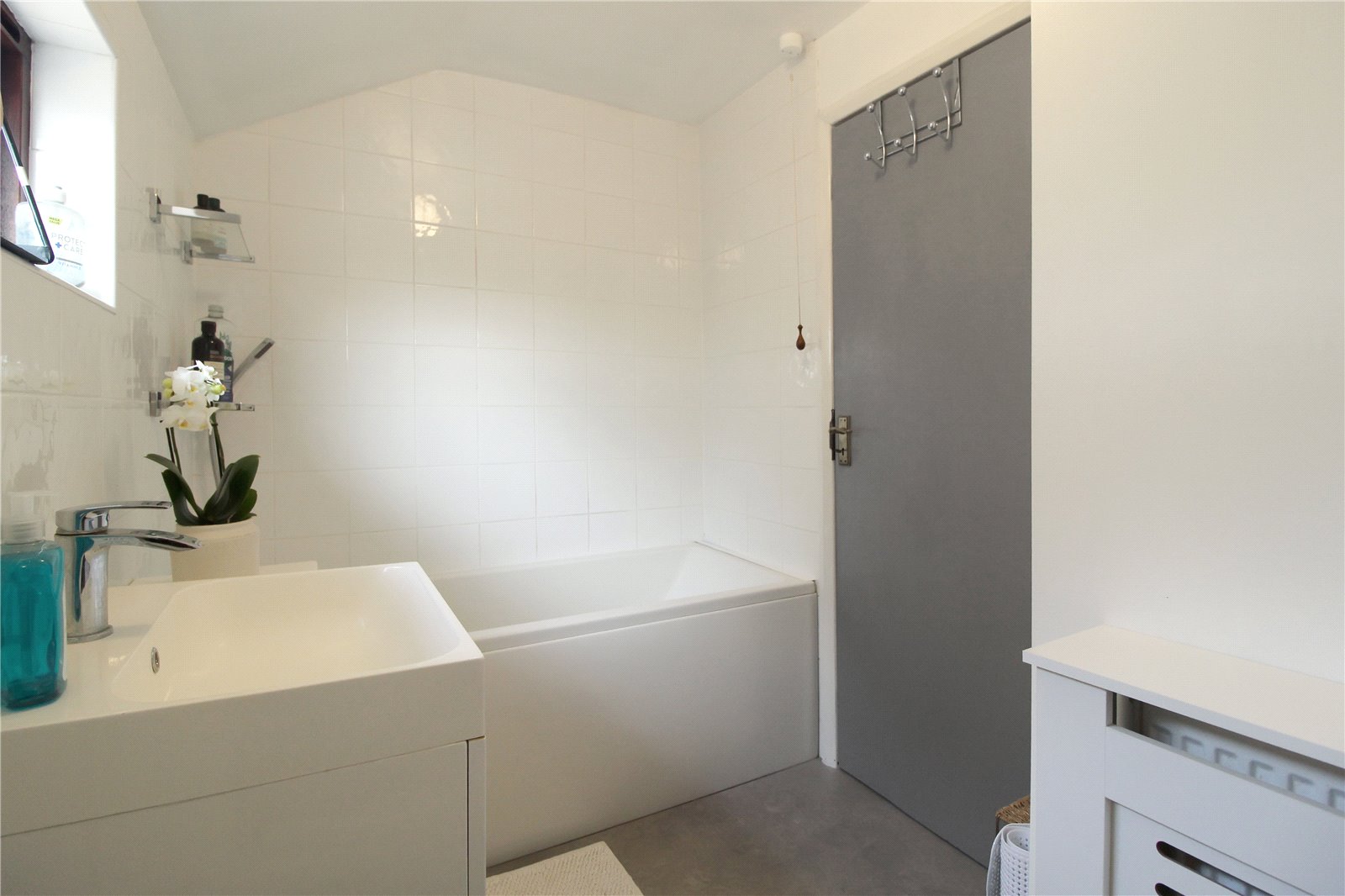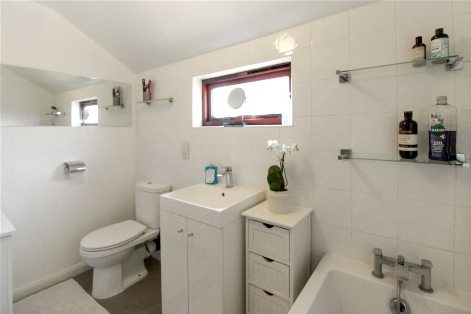 Double glazed obscure window to side, vinyl to floor, tiled walls, ceiling light, bath, sink with vanity unit under, WC, radiator.
