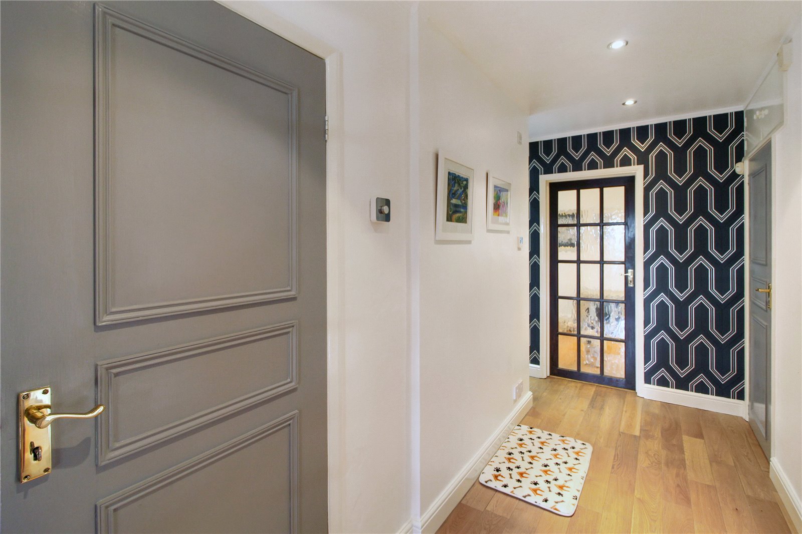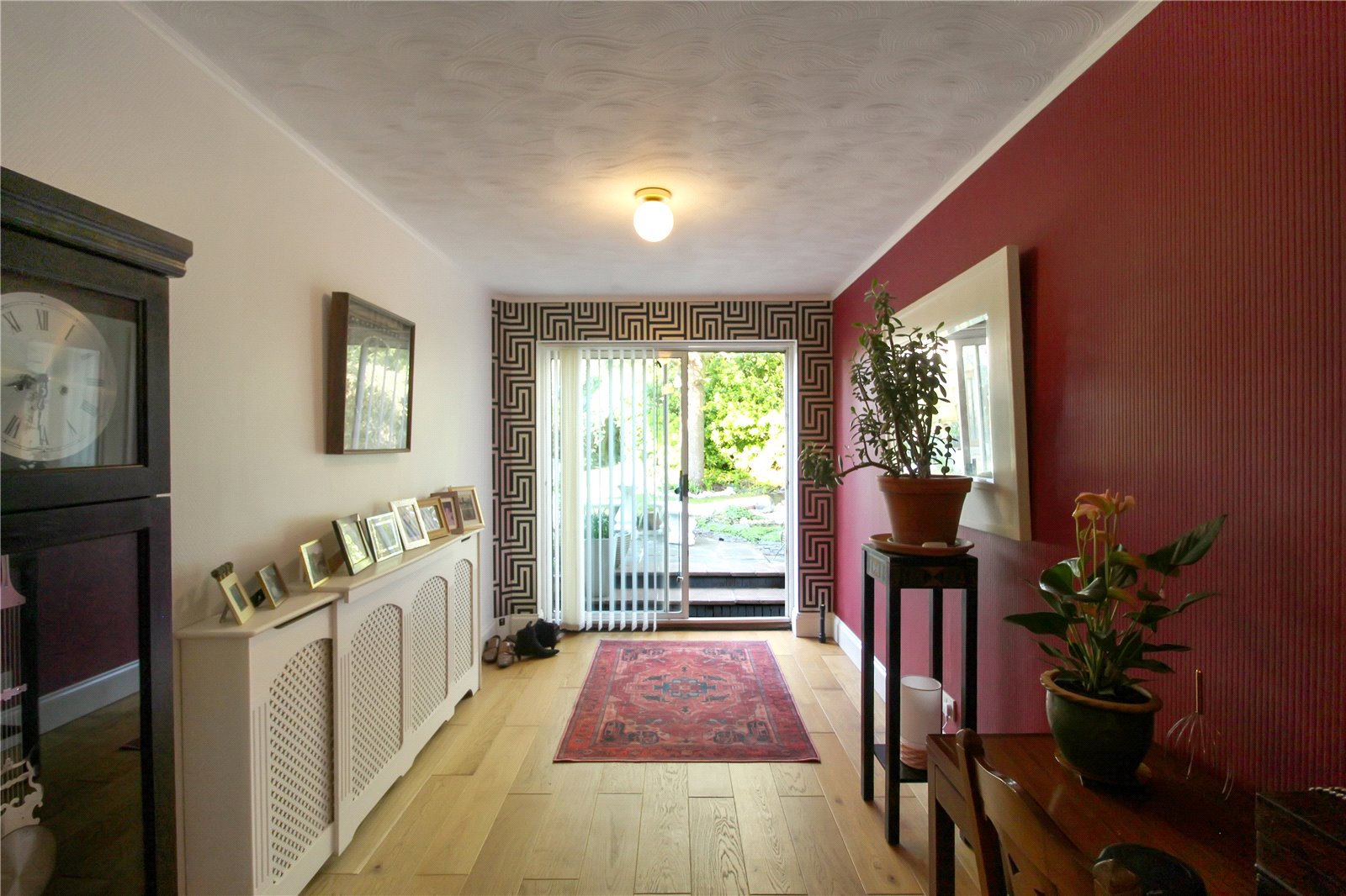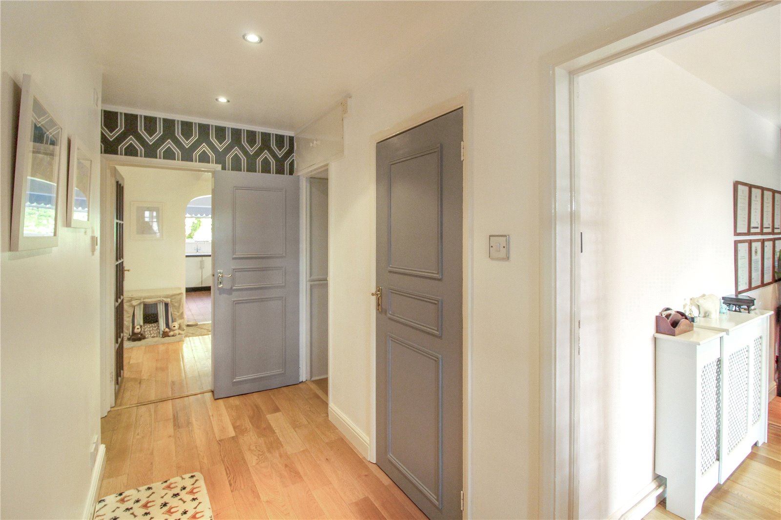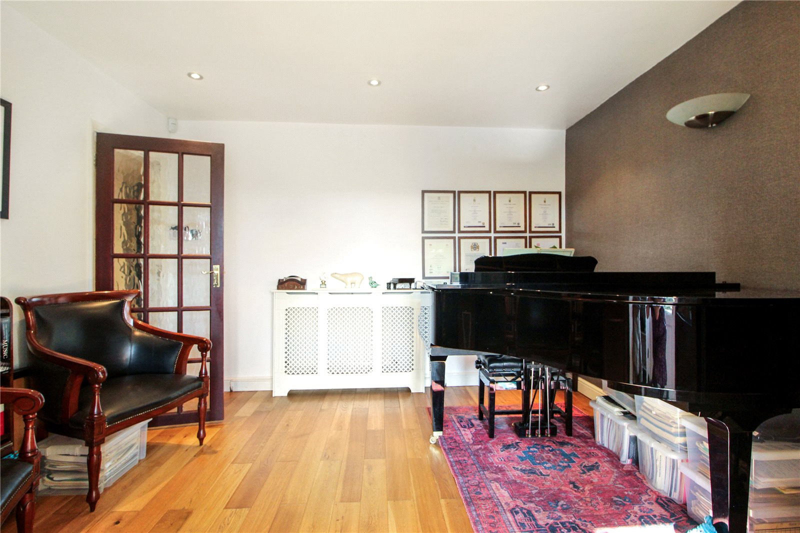 A beautiful bright and spacious reception hall / reception room, with wooden floor, smooth ceiling, spotlights to ceiling, radiator, wall lights, door leading to: