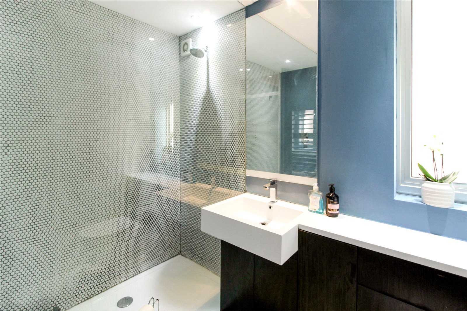 Large walk-in shower, sink with vanity unit under, underfloor heating, towel rail, vinyl to floor, part tiled walls.