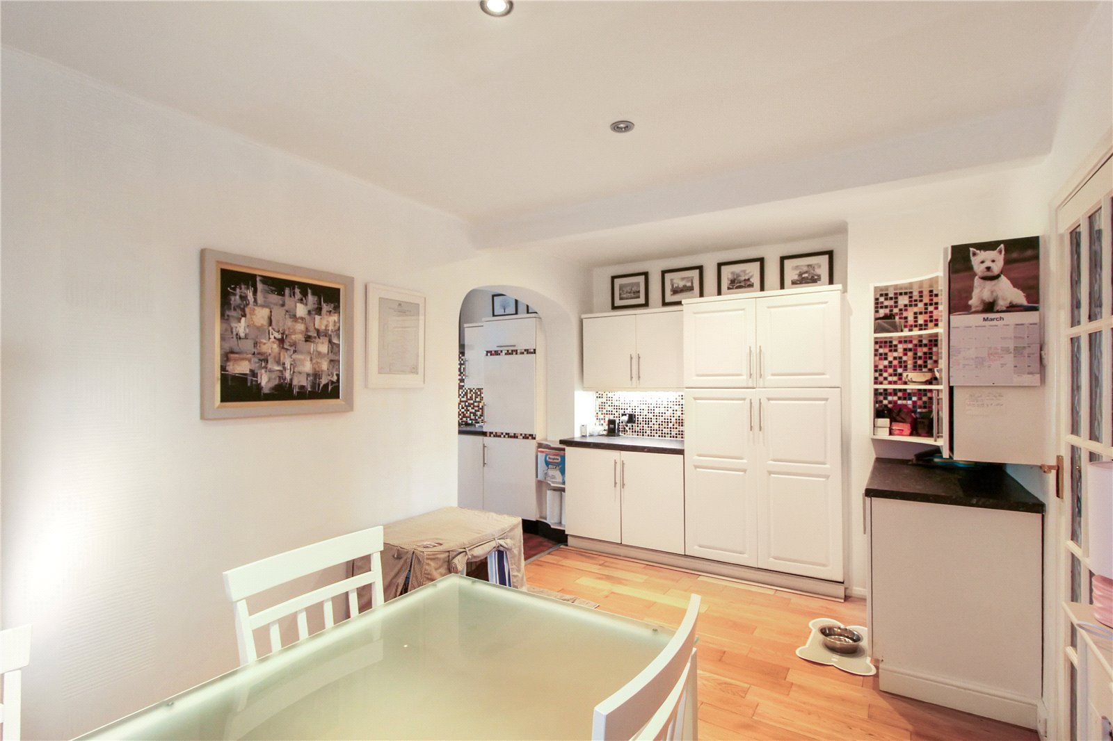 Breakfast / dining area with wooden floor, further units, obscure double-glazed window to side, radiator, smooth ceiling, spotlights to ceiling.