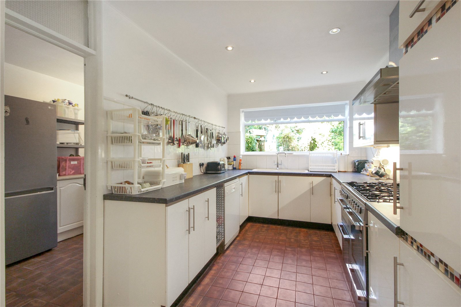 Fitted with a range of eye and base level units, space for fridge freezer, dishwasher and range oven, sink and drainer unit, stone tiled floor, smooth ceilings, spotlights to ceiling, double glazed window to rear, opening onto:
