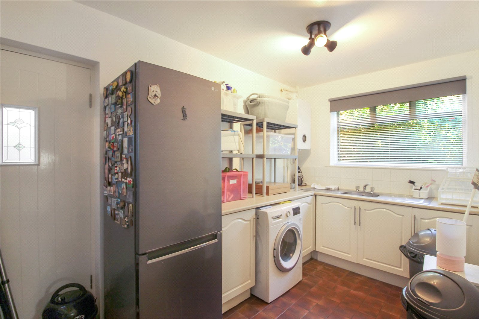 Stone tiled floor, smooth ceiling, ceiling light, a range of base units, space for washing machine and dryer, sink and drainer, double glazed window to rear, door for side access to rear garden.