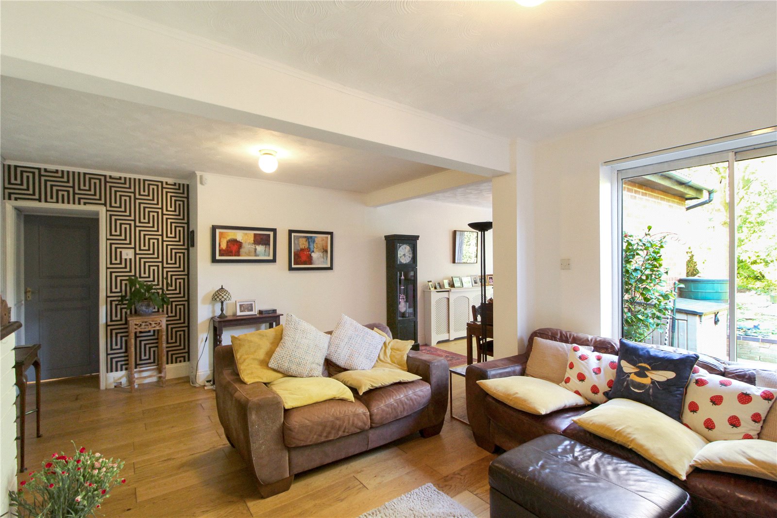 A large, L shaped room with two sets of sliding doors to rear garden, wooden floor, 3 x ceiling lights, 2 x radiators, door leading to: