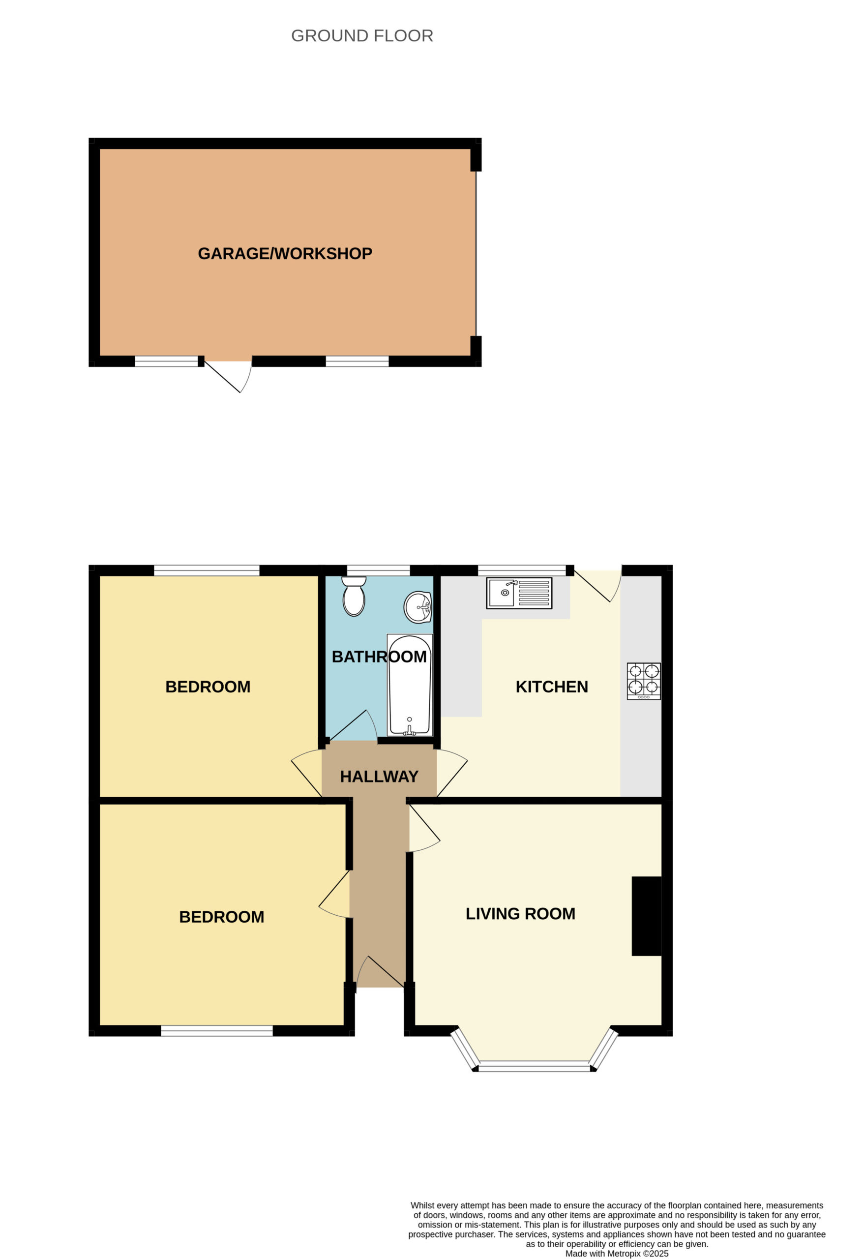 Located to the rear of the garden is a larger-than-average pitched roof garage/workshop, featuring an up-and-over door to the front and a courtesy door to the side. The garage further benefits from a pair of windows, along with power and lighting connected.