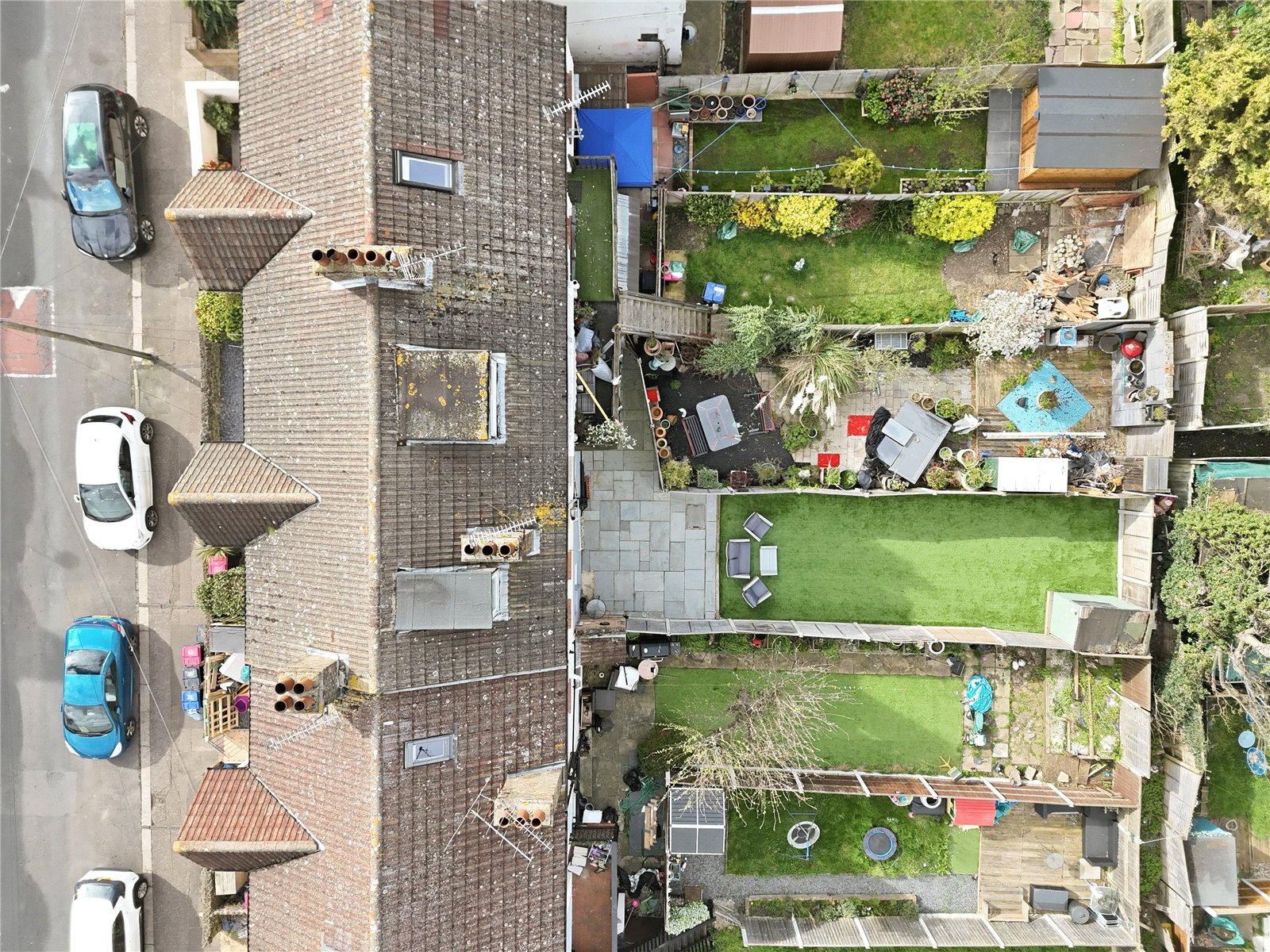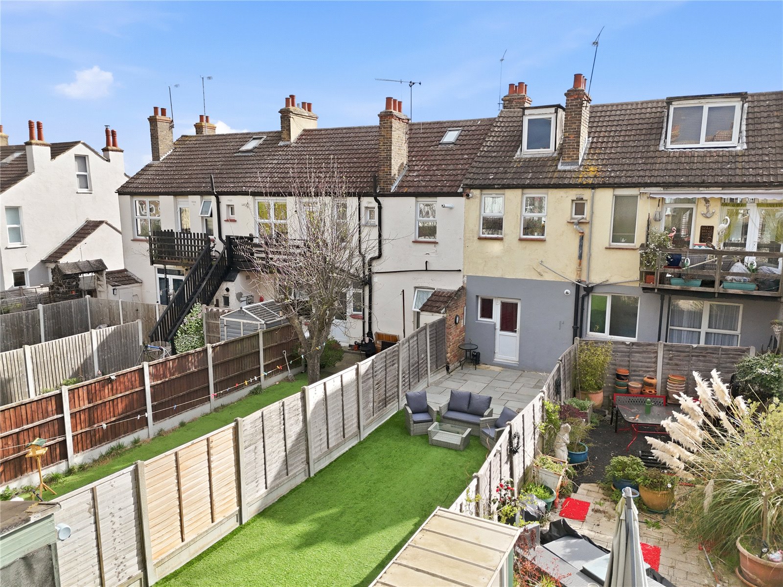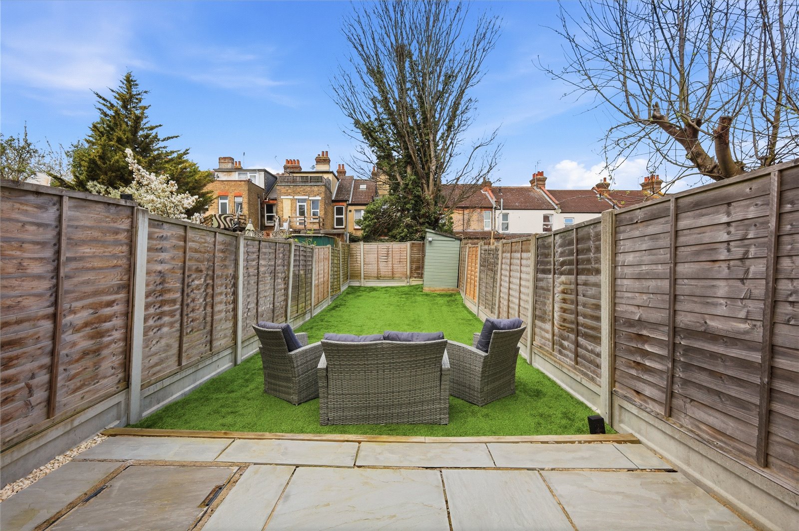 The rear garden measures an approx. 50ft in length and commences with an '' Indian Sandstone '' paved patio area with the remainder being artificial lawn with hardstanding base to the rear for storage shed. Fenced boundaries. External water tap. Brick built shed to the side of the plot.
