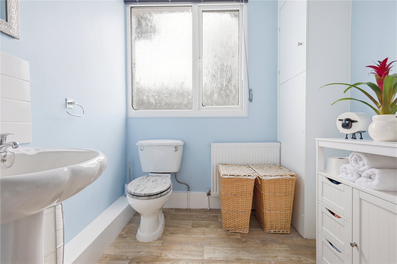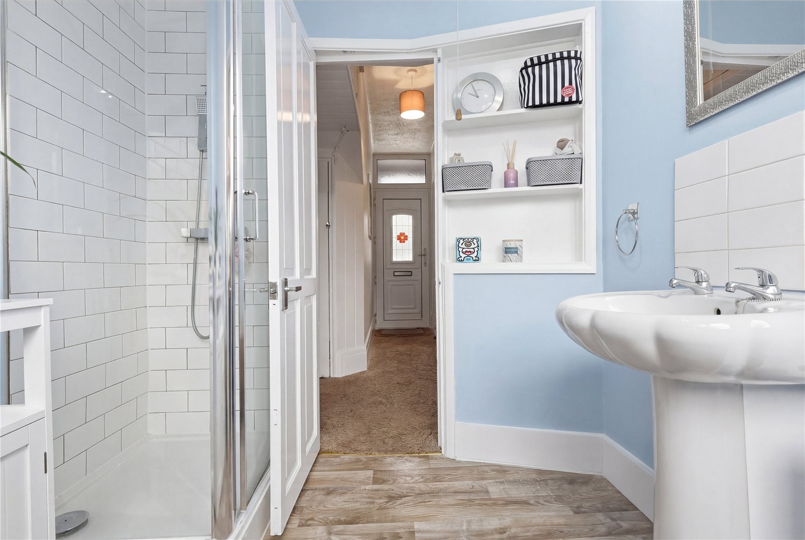 Opaque upvc double glazed window to the rear aspect. Fitted with a modern white three piece suite comprising of low level w.c, pedastal wash hand basin with tiled splash back and tiled shower cubicle with twin headed shower unit. Smooth plastered walls and ceiling. Single banked radiator. Shelved recess. Cupboard housing central heating combination boiler.