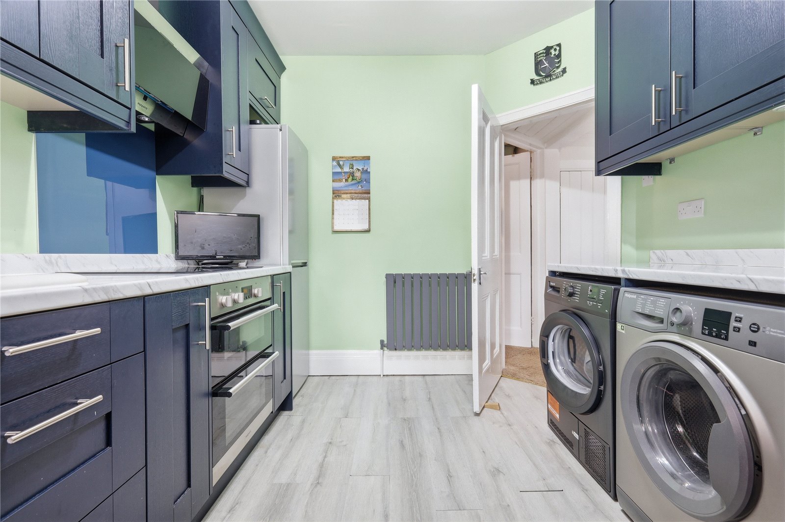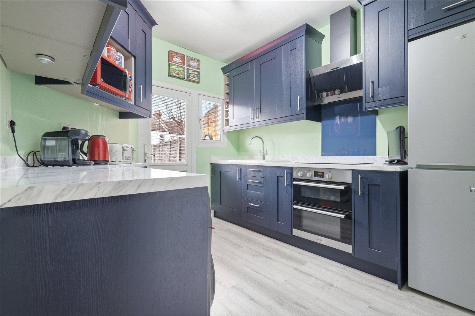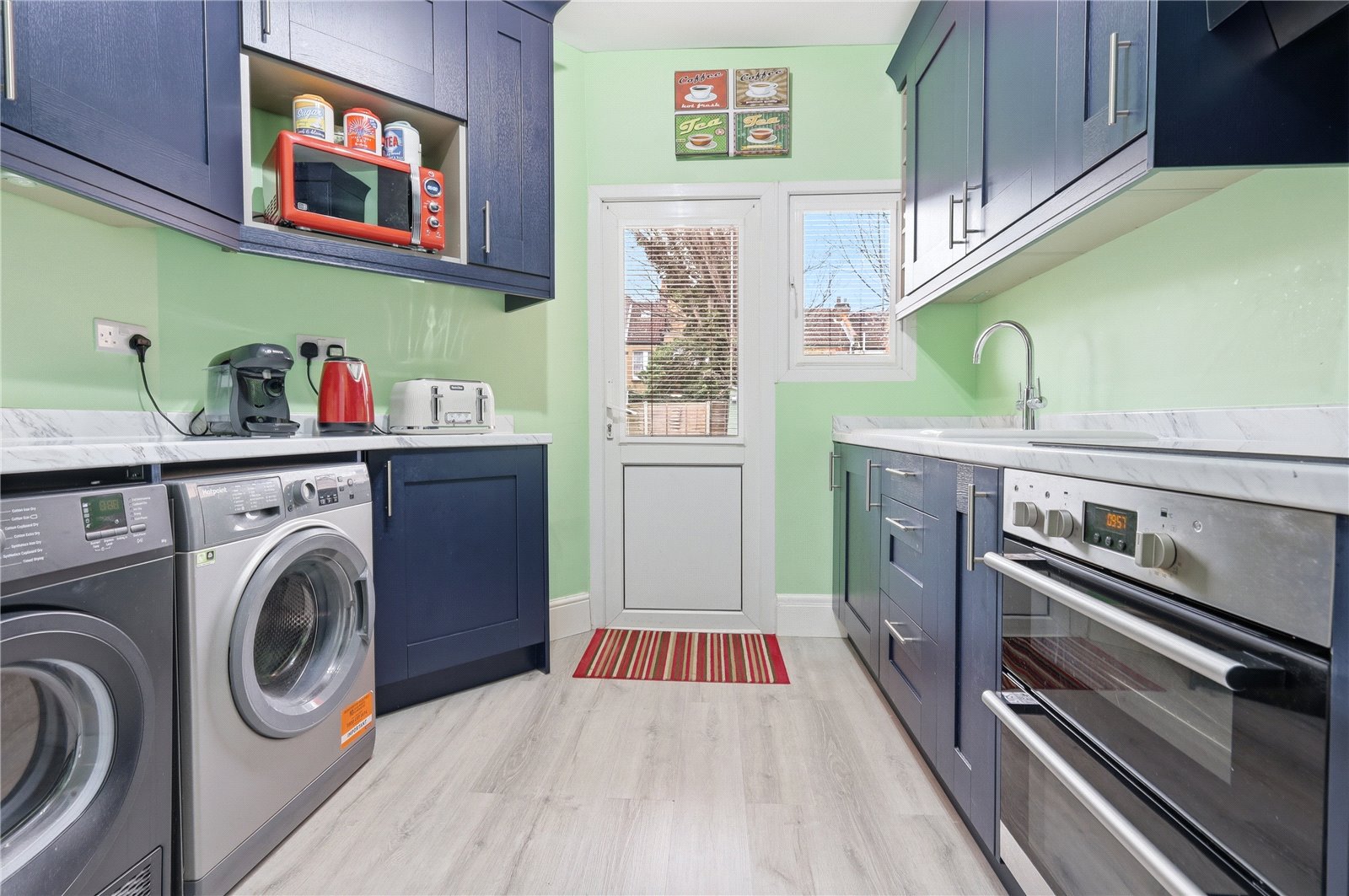 Upvc double glazed window to the rear aspect with door adjacent giving access to the rear garden. The kitchen is fitted with a range of modern base units with roll edge work surfaces incorporating a ceramic single drainer sink unit with stainless steel mixer tap. Integrated four ring induction hob with extractor fan over. Integrated double oven. Further matching wall mounted storage units. Space and plumbing for washing machine and tumble drier. Space for fridge/freezer. Smooth plastered walls and ceiling. Laminate wood effect flooring. Single banked radiator.