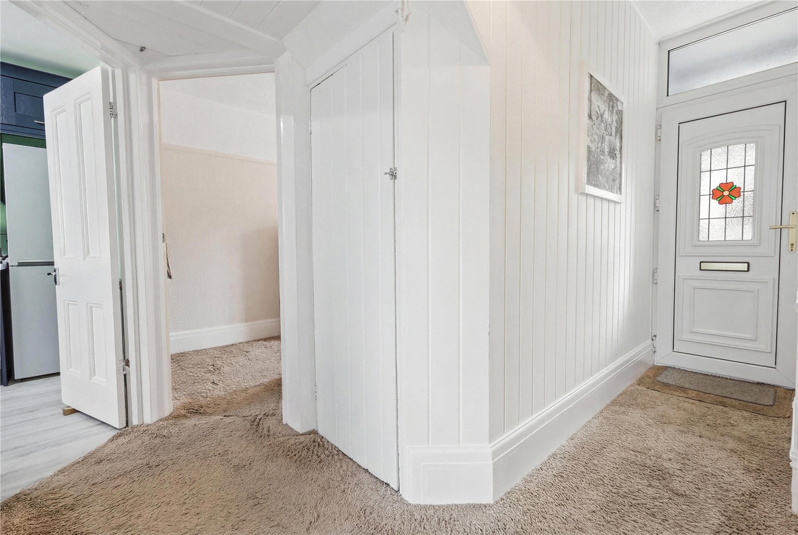 Coved cornicing with textured ceiling. Single banked radiator. Wood panelling to walls and feature brick wall adjacent. Two overhead storage cupboards. Understairs storage cupboard housing fuse board with trip switch. Four panelled doors leading to rooms: