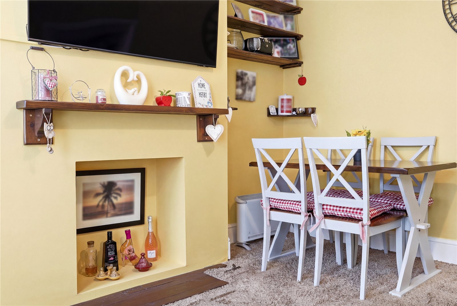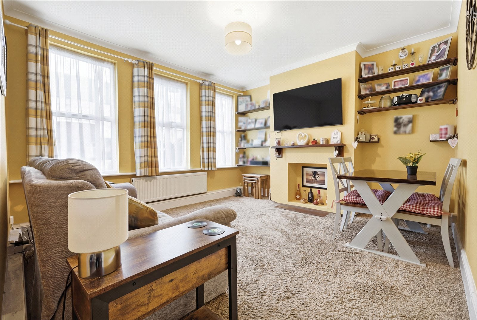 Three upvc double glazed windows to the front aspect. Coved cornicing with smooth plastered ceiling. Double banked radiator. Internet point. Television aerial point. Feature fireplace with shelved chimney stack recess.