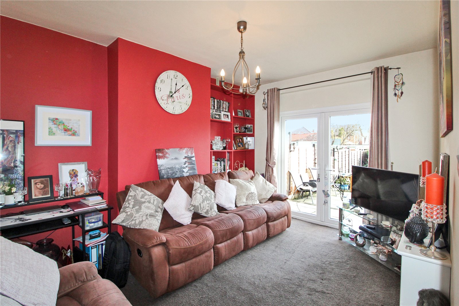 uPVC double glazed French doors to rear. Carpet to floor. Radiator and radiator cover. Fitted shelving unit in recess. Smooth plastered walls and ceiling with ceiling light.