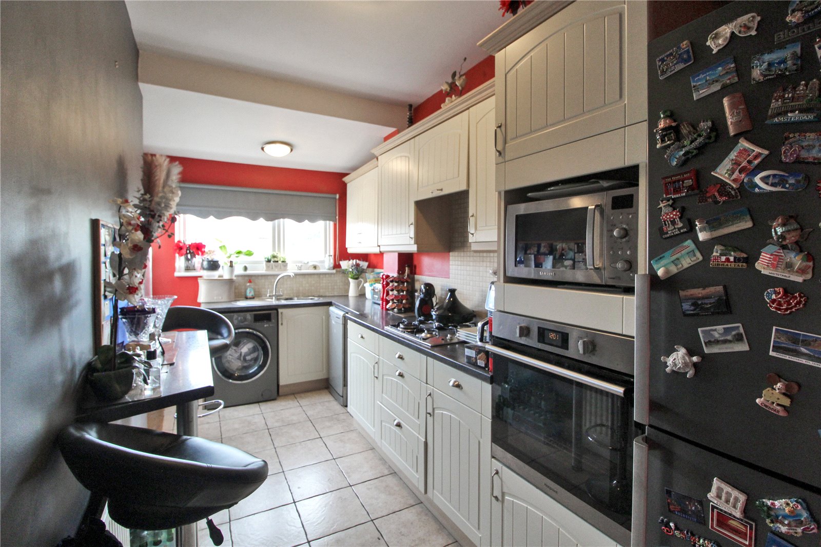 uPVC double glazed window to rear overlooking the garden. uPVC double glazed door to side into garden. Fitted with a work suface incorporating stainless steel sink and drainer unit with chrome monobloc mixer tap, four ring gas hob with extractor hood above, tiled splashback, wall-mounted eye-level oven with recess above for microwave and fitted with a comprehensive range of base and eye-level cabinets. Space for washing machine, dishwasher and upright fridge/freezer. Fitted with additional worksurface doubling up as a breakfast bar. Tiled floor. Radiator. Smooth plastered walls and ceiling with two ceiling lights.