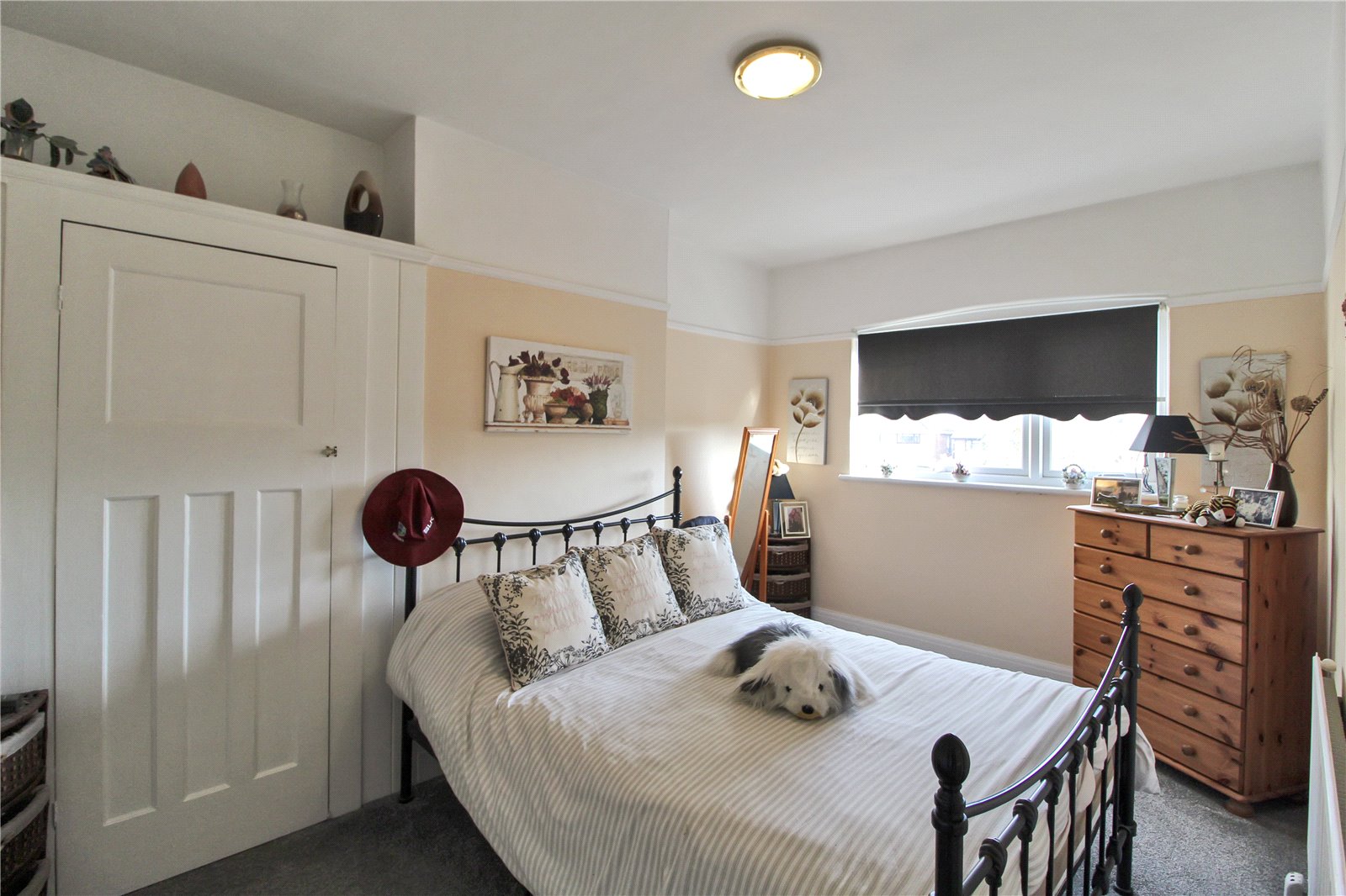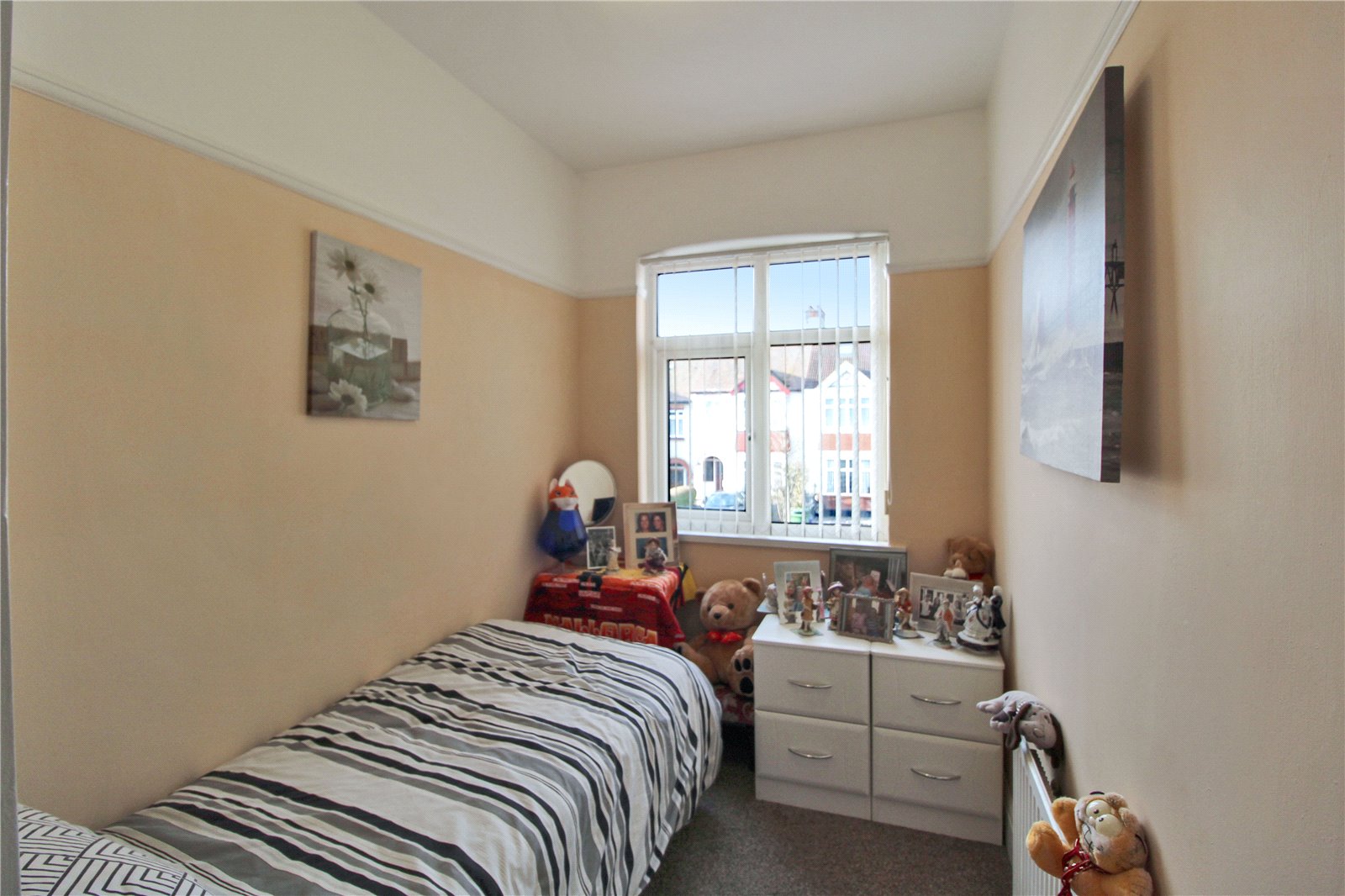 Third bedroom with carpet to floor, smooth ceiling, ceiling light, radiator, uPVC double glazed window to front aspect.