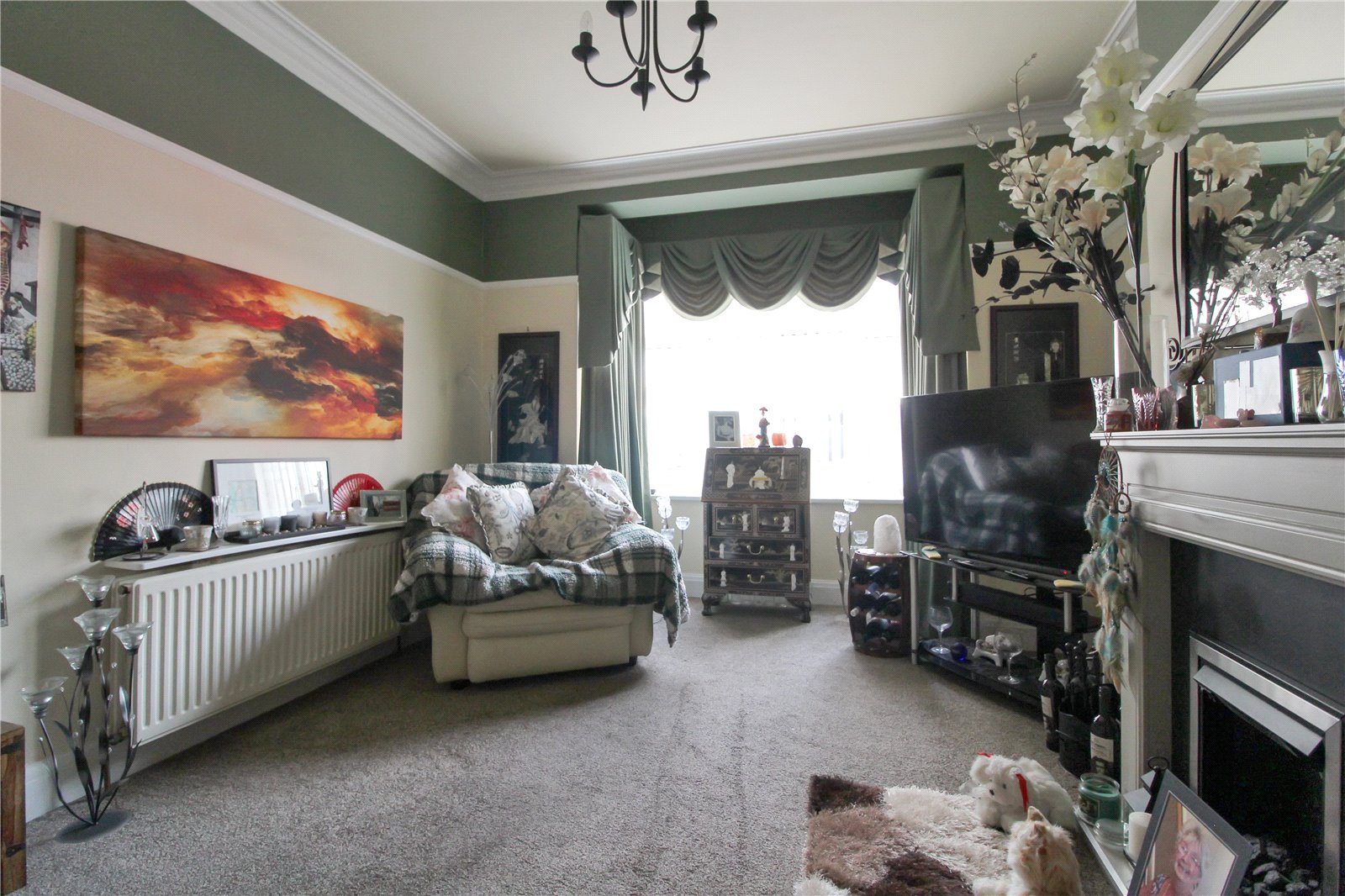 uPVC double glazed bay window to front. Carpet to floor. Radiator. Feature electric fireplace with decorative wooden surround. Smooth plastered walls with wall light and coving to smooth plastered ceiling with ceiling light.