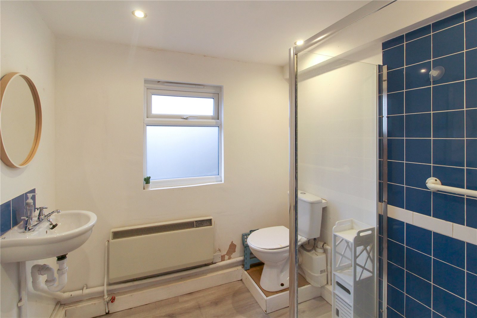 Conservatory housing three-piece shower room with UPVC double glazed obscure window to rear aspect. Shower room includes low level wc, enamel hand wash basin with chrome taps, walk-in shower cubicle with chrome shower attachment. Partially tiled walls with smooth plaster finish. Smooth plastered ceiling with fitted spotlights.