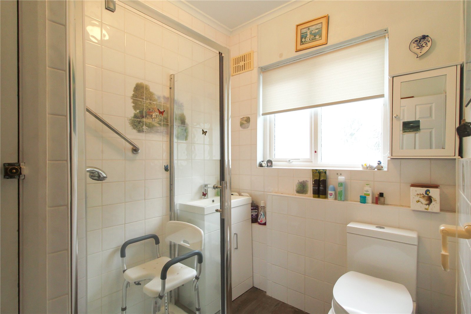 UPVC double glazed window to side aspect. Three-piece bathroom suite including low level wc, enamel hand wash basin with chrome mixer tap and vanity unit, and walk-in shower. Cupboard space. Wood effect flooring, Tiled walls and smooth plastered ceiling, completed with coving and ceiling light.