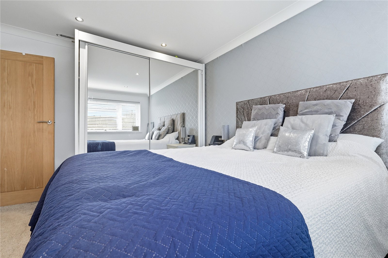 uPVC double glazed window to rear, overlooking the south-facing landscaped rear garden. Lipped skirting. Radiator. Coved cornice to ceiling with recessed LED lighting. A sliding shaker style door gives access to a walk-in wardrobe with hanging and shelved storage space and courtesy light. (Agent’s note: This room is suitable for conversion to an en suite cloakroom/shower, with plumbing already in situ).