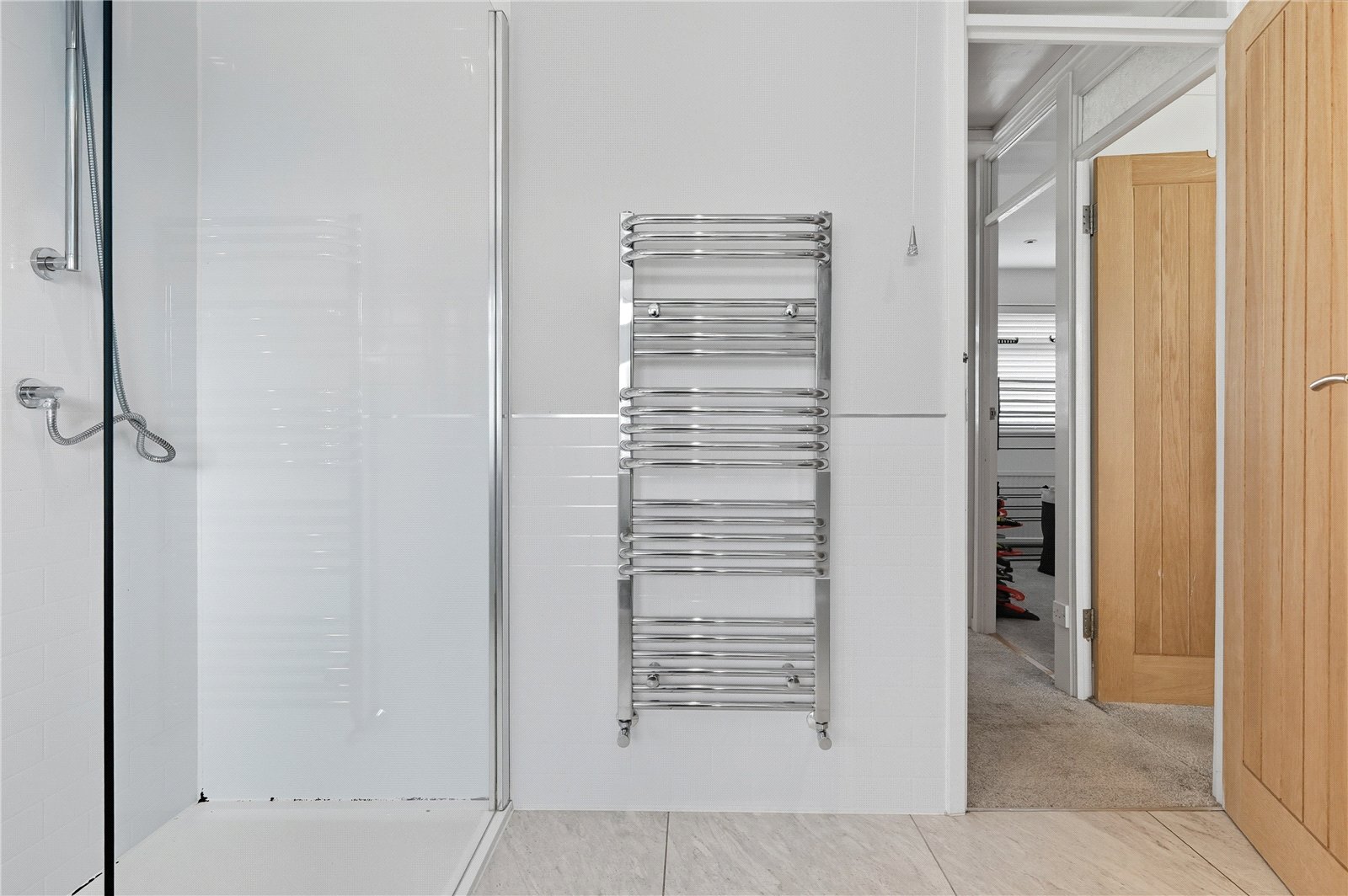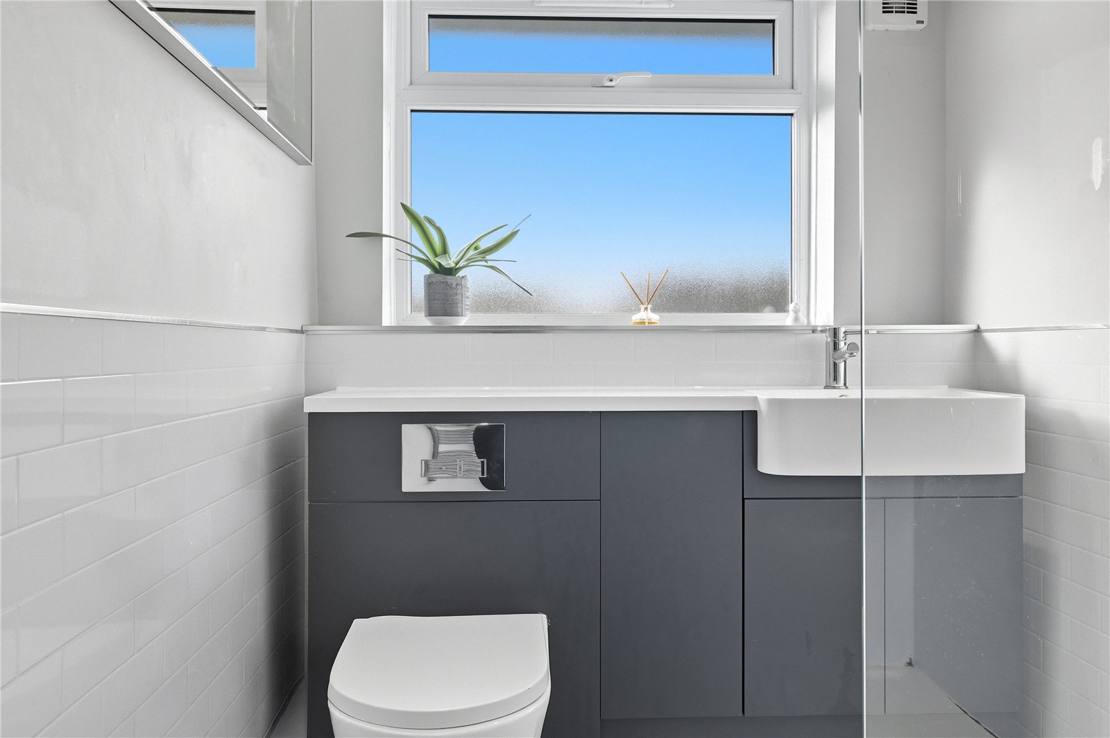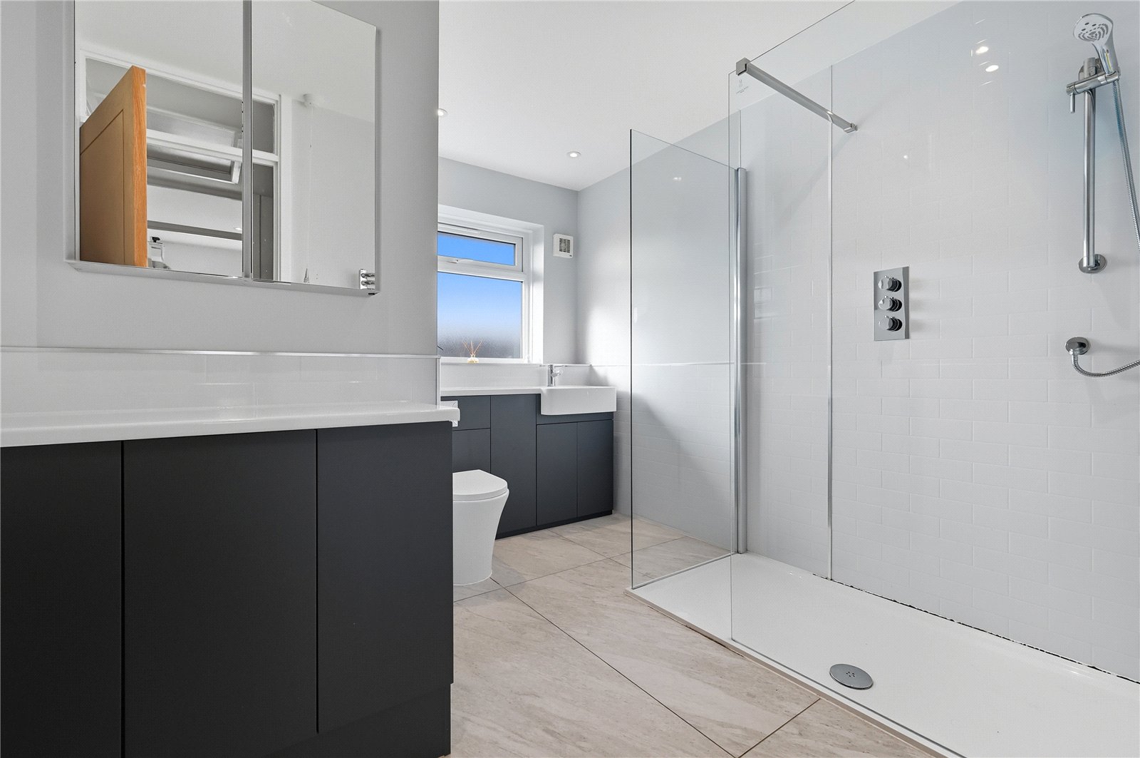 An exceptionally spacious, professionally planned and fitted room. Obscure double glazed window to rear. Fitted with a three piece suite comprising of triple size frameless glass 'wet room' style shower enclosure with wall inset faucet and overhead drench/rainwater and handheld shower fittings, vanity wash basin with matching bathroom furniture, and integrated cistern dual flush WC with storage cabinets. White metro tile effect marbolic panelling to dado height with aluminium bordered edging. Bespoke fitted bathroom storage furniture matching the vanity unit. Two wall light points. Extractor fan. Full height designer heated towel rail. Drop light switch. Smooth plastered ceiling with recessed LED lighting.