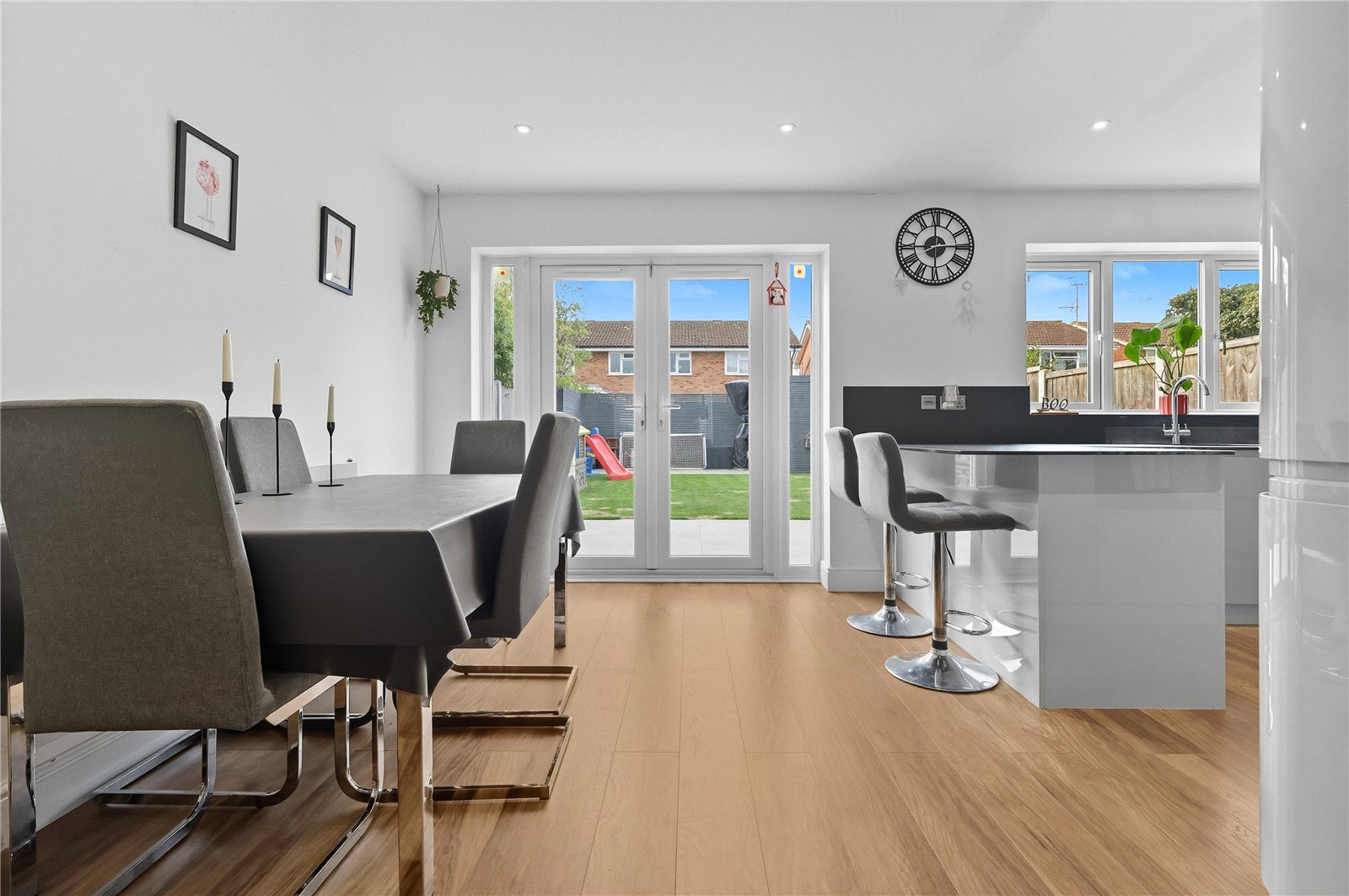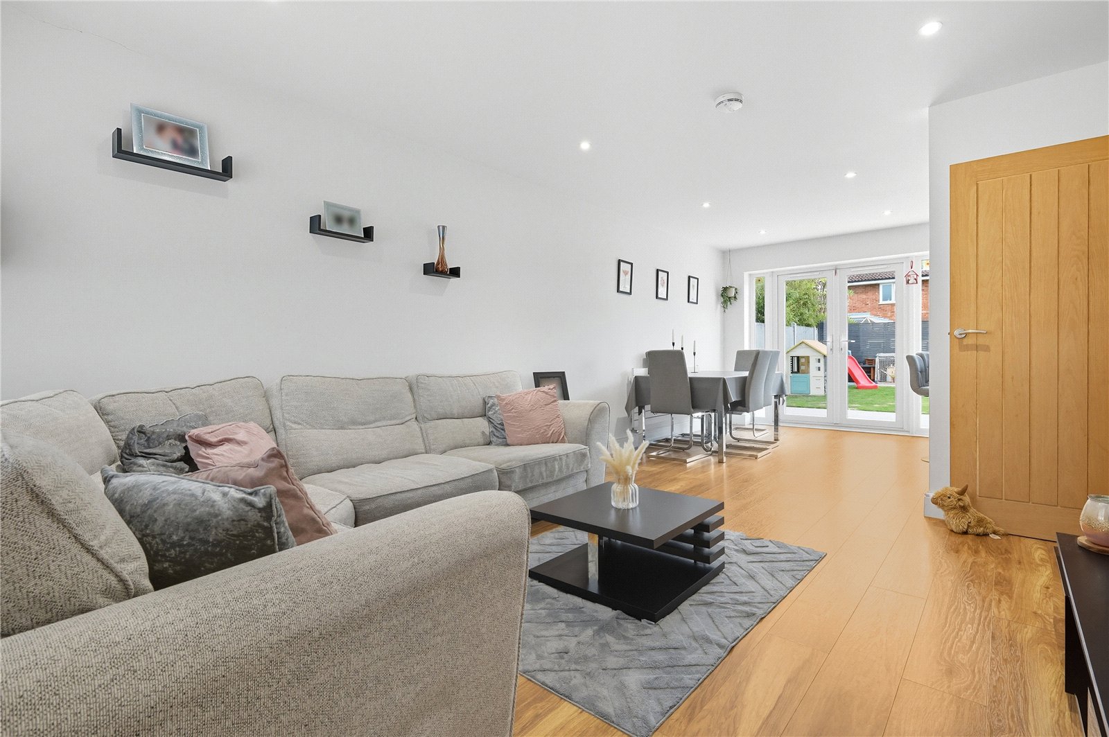A dual aspect room has uPVC double glazed French doors with matching side panels leading onto a south facing landscaped garden, and uPVC double glazed window to front. Oak effect flooring. High level lipped skirting. Horizontal designer radiator. Television aerial point. An oak Shaker door gives access to a staircase to the first floor accommodation. Smooth plastered ceiling with recessed LED lighting. The sitting/dining room leads through in open plan style to: