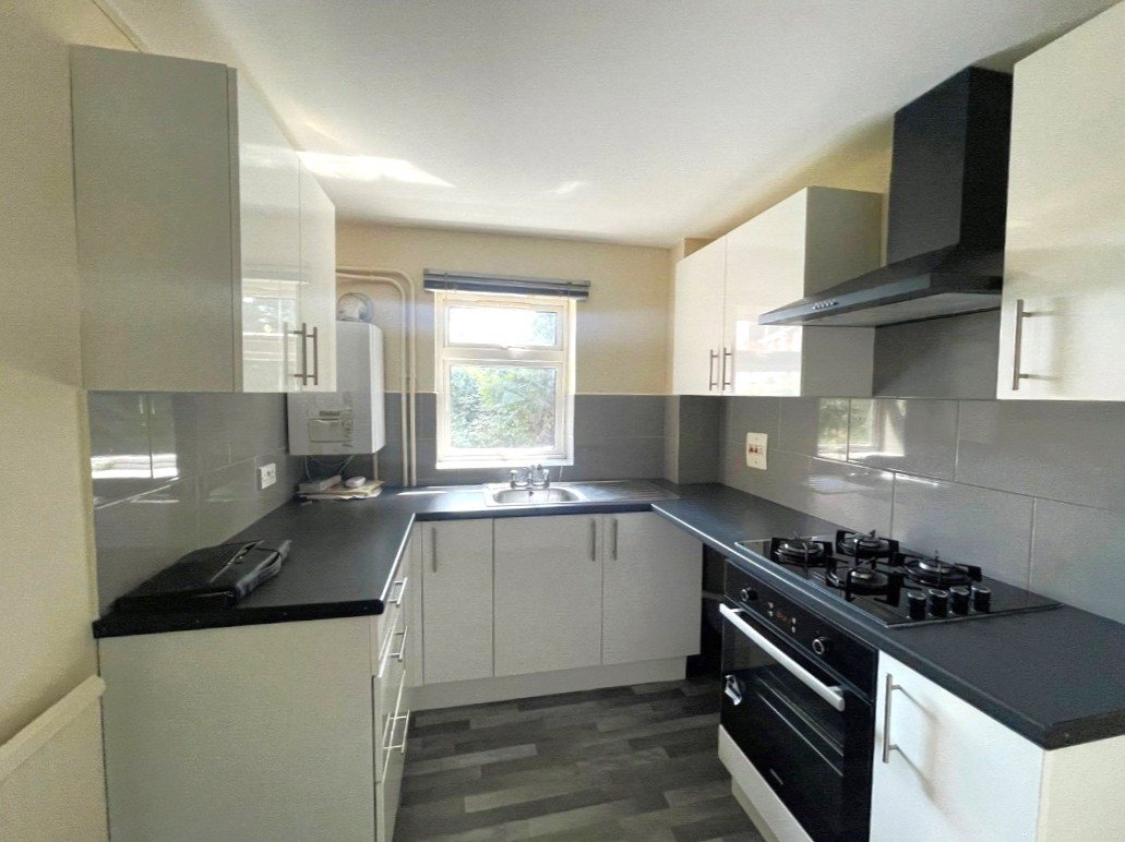 uPVC double glazed window to side aspect. A well-presented kitchen fitted with a range of contemporary gloss wall and base units with contrasting dark work surfaces inset with a single drainer stainless steel sink unit. Attractive large format gloss style tiled splashbacks. There is an integrated oven with four ring gas hob and wall mounted extractor hood over, together with space for additional appliances. Wall mounted boiler. Radiator. Wood effect flooring. Smooth plastered ceiling.