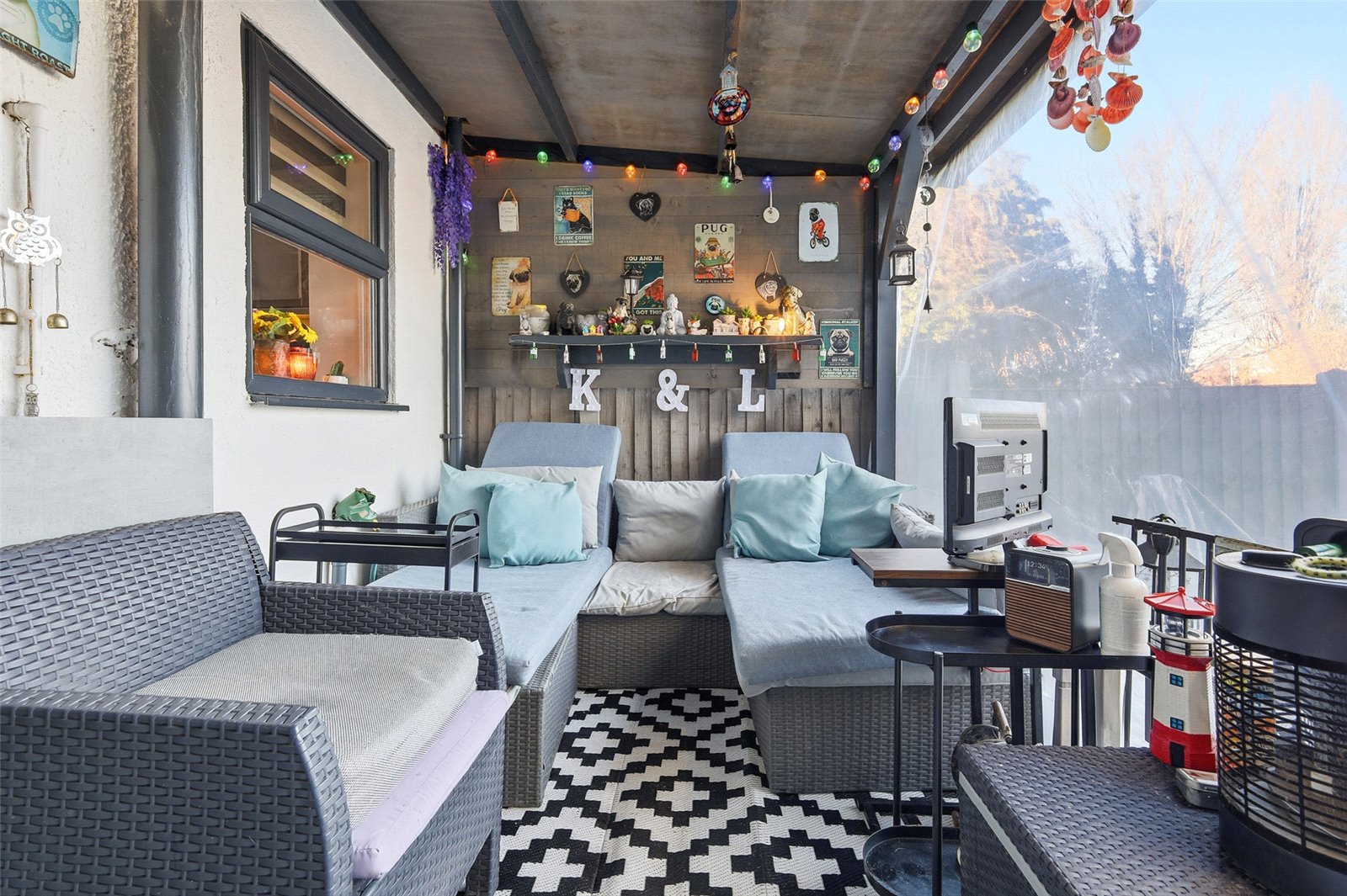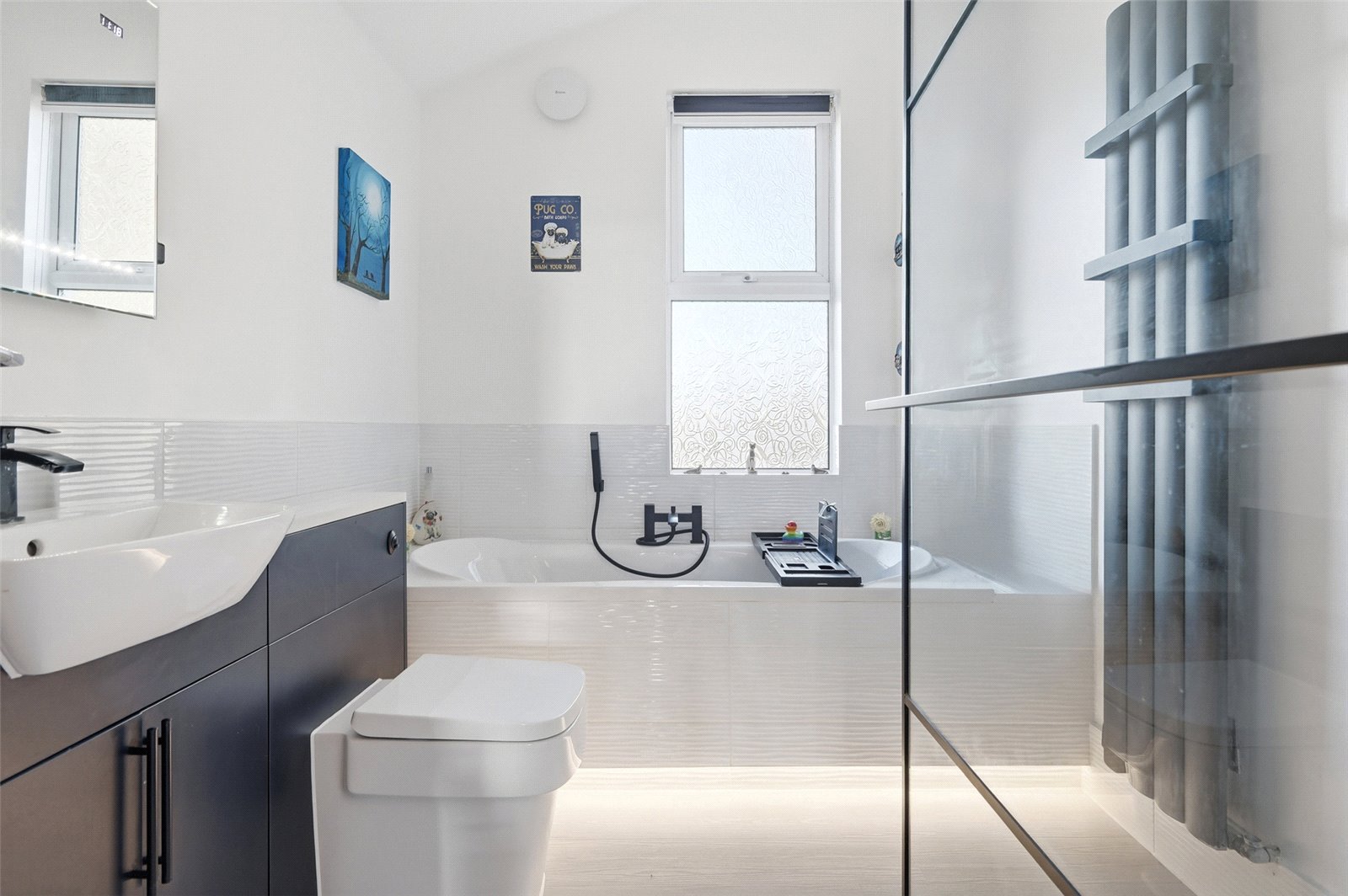 UPVC double obscured glazed window to rear. Bathroom is fitted with a modern and contemporary four piece suite comprising low flush WC, countertop wash basin with mixer tap and storage cupboards beneath. Panelled bath with central bath filler mixer tap and detachable showerhead. Larger than average walk in shower enclosure with wall mounted mixer, rainfall showerhead plus further detachable showerhead and Crittall effect shower screen. Contemporary heated towel rail. Wall mounted vanity mirror with integrated LED lighting, clock feature and electric shaver charging point. Wood effect vinyl flooring. Part tiled walls. Smooth plastered ceiling with recessed LED lighting. Wall mounted extractor fan.