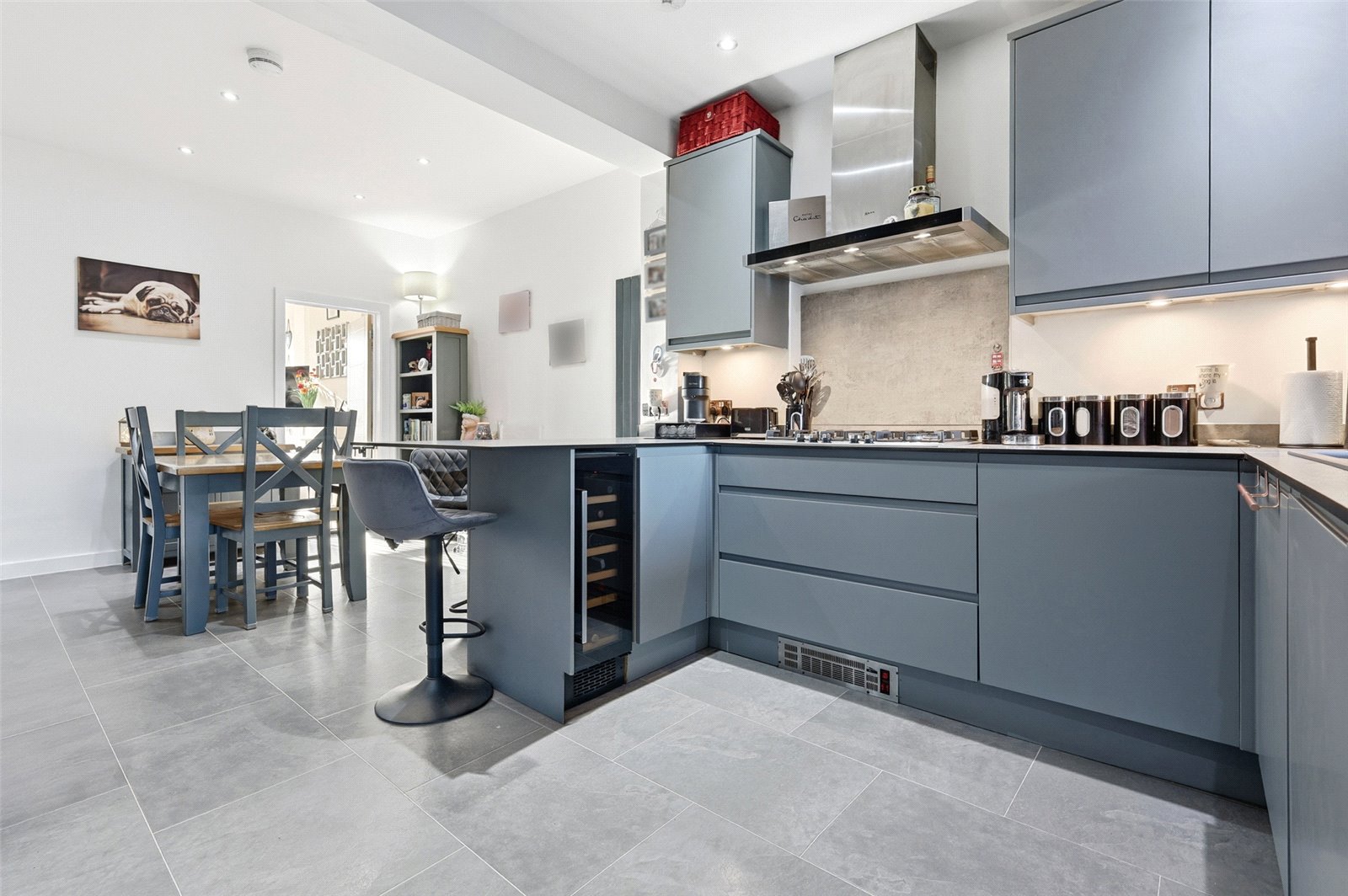 overall size. UPVC door to rear with inset glaze panels leading to rear garde. Double glazed window to rear. Kitchen is fitted with a modern and contemporary range of base and eye level handleless cabinets incorporating a slimline squared edge working surface. Inset composite one and half bowl sink with mixer tap and drainer unit. Inset five burner Neff gas hob with Neff extractor hood above. Integrated Neff electric fan assist oven with matching convector oven above. Space for American style fridge/freezer. Integrated washing machine, dishwasher and under counter wine cooler. cupboard housing gas fired boiler. Fitted peninsular breakfast bar unit. Wall mounted designer radiator. Understairs storage cabinets. Tiled effect Karndean flooring throughout. Wall mounted extractor fan. High level skirting. Smooth plastered ceiling with recessed LED lighting. Stairs rising to first floor accommodation.