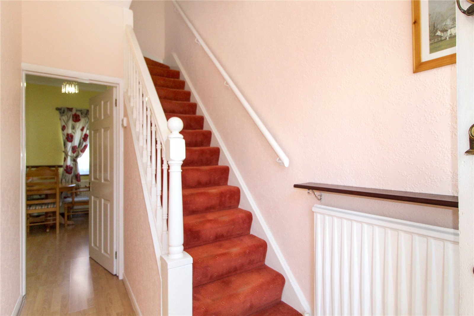 Wood-effect laminate flooring. Skirting. Radiator. Thermostat. Smoke Alarm. Ceiling light. Stairs to first floor landing and door to