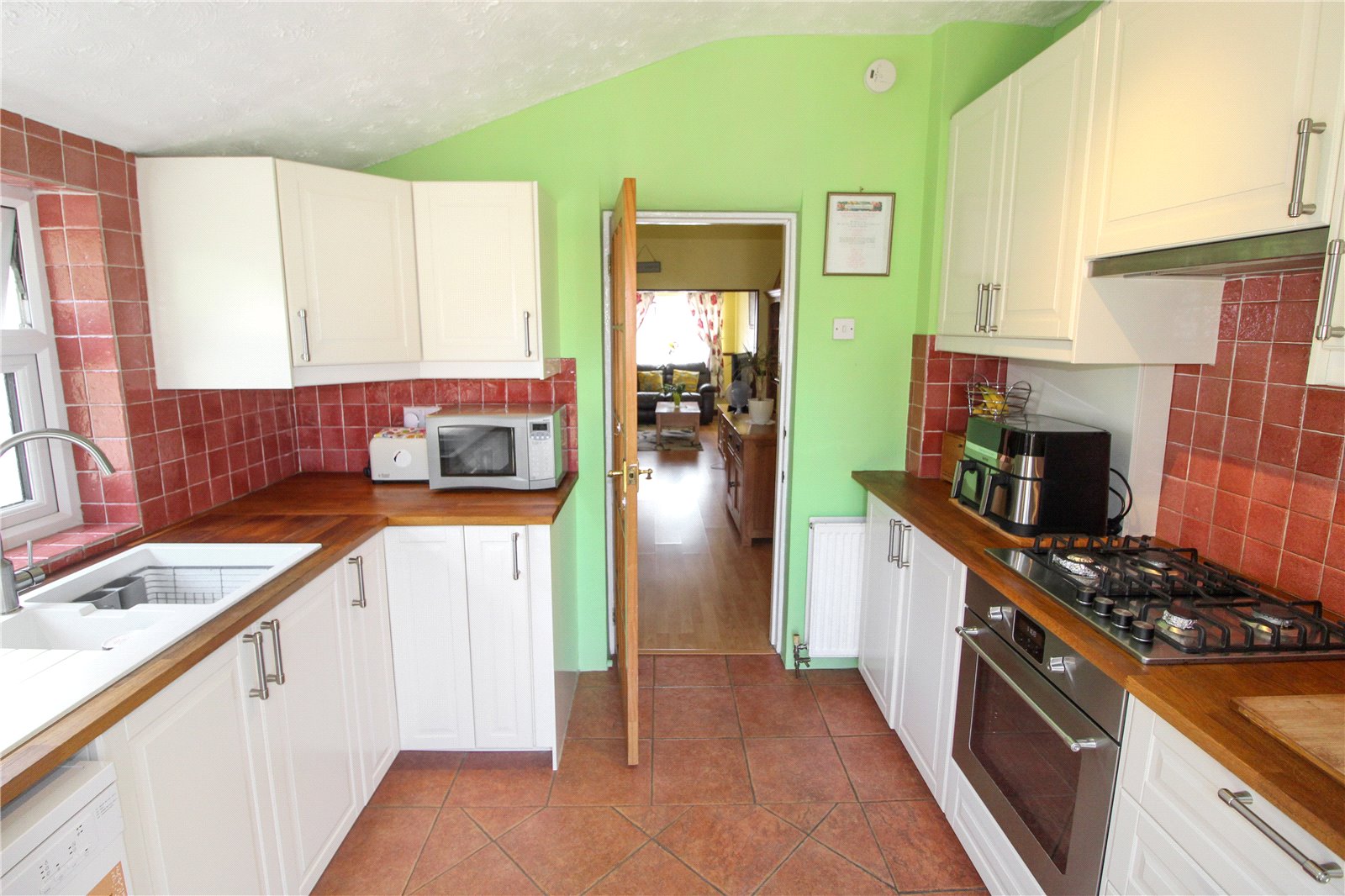 Fitted with a worksurface incorporating four ring gas hob, oven under and extractor fan above. A further worksurface incorporates a bowl and a quarter sink and drainer unit with mixer tap. Tiled splashbacks are fitted to both work surfaces with a range of base and eve level cupboards. Cupboard housing combi boiler. Space for slimline dishwasher, space for washing machine and space for fridge/freezer. Tiled floor. Ceiling light. Smoke alarm.