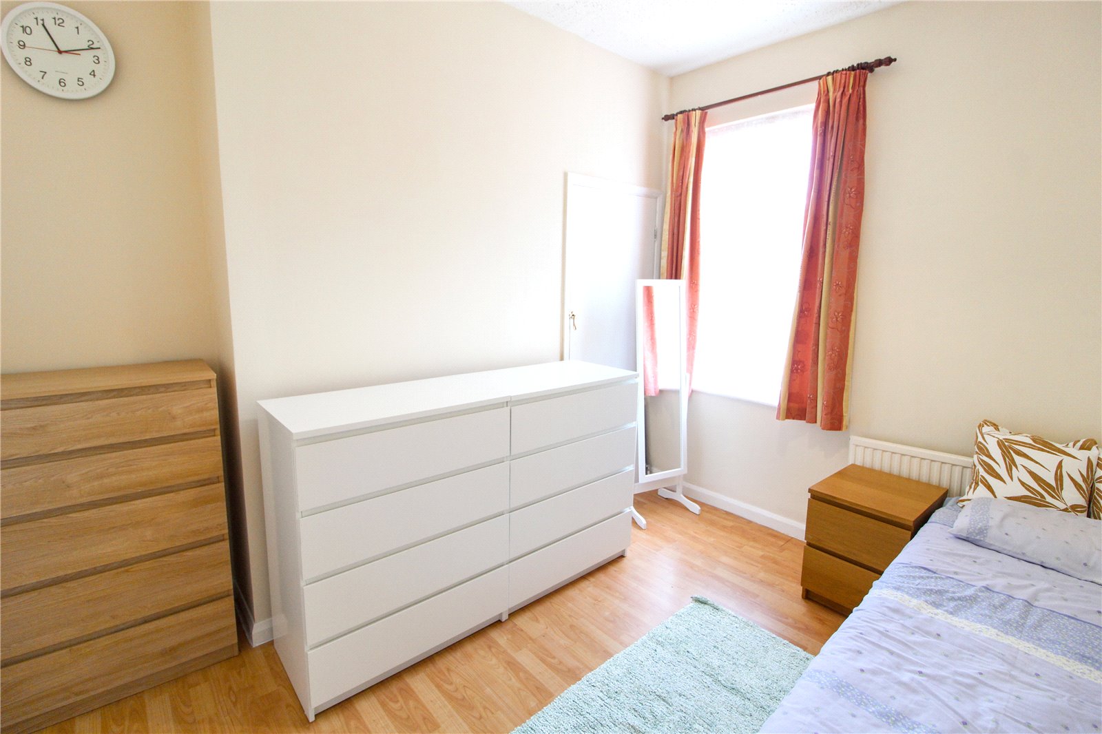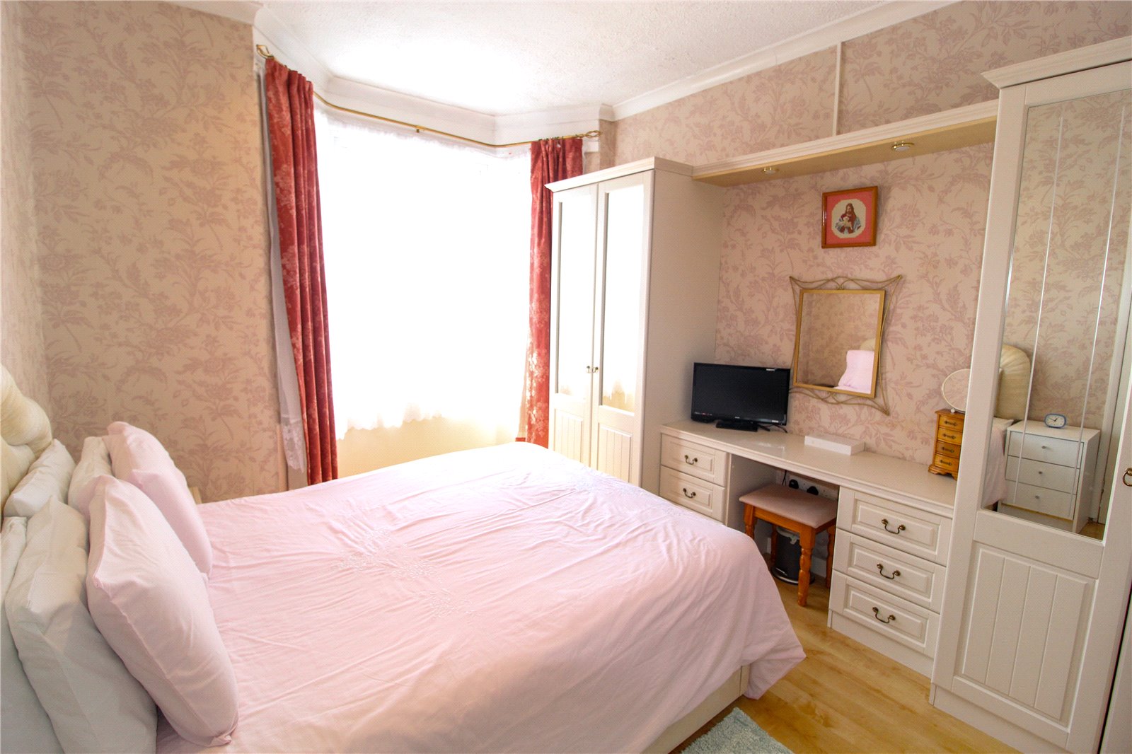 uPVC double glazed bay window to front. Wood-effect laminate flooring. Radiator. Two built-in wardrobes and dresser unit. Spotlights.