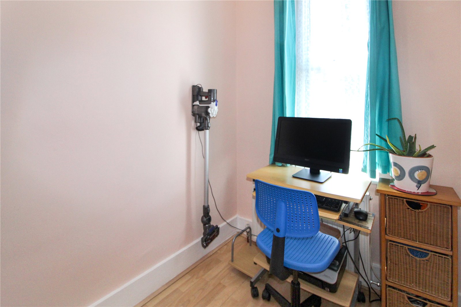 uPVC double glazed window to front. Wood-effect laminate flooring. Skirting. Radiator. Smooth plastered walls. Ceiling light.