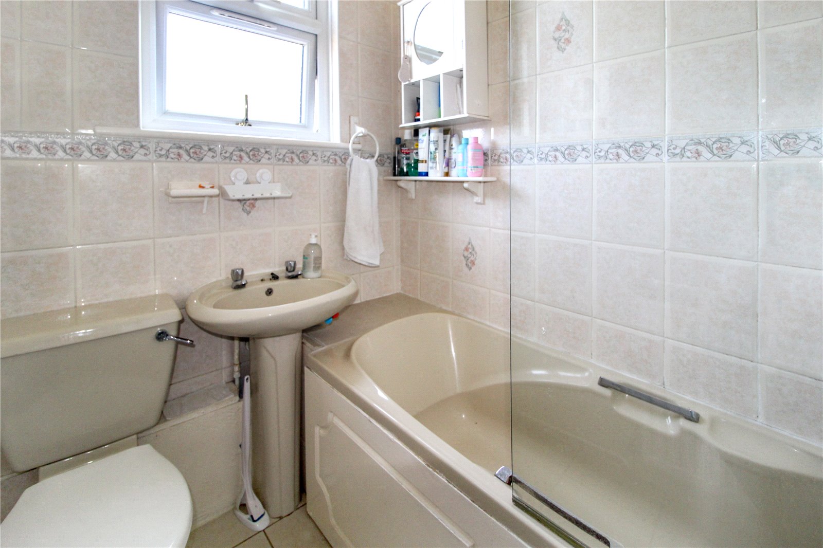 uPVC double glazed obscure window to rear. Fitted with a three-piece suite comprising panel enclosed bath with wall-mounted shower attachment above, pedestal wash hand basin and low level w.c. Tiling to floor and walls. Extractor fan. Ceiling light.
