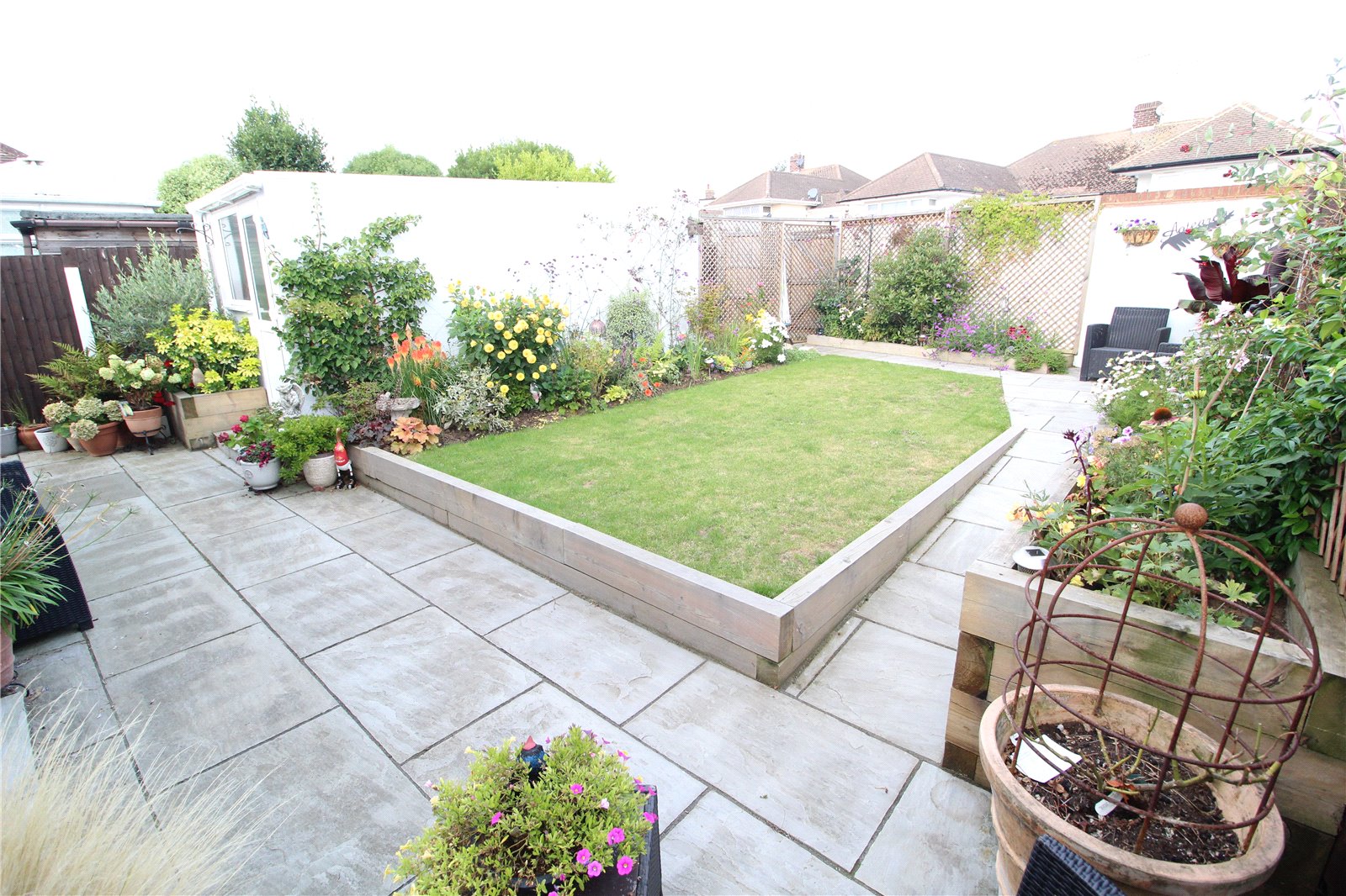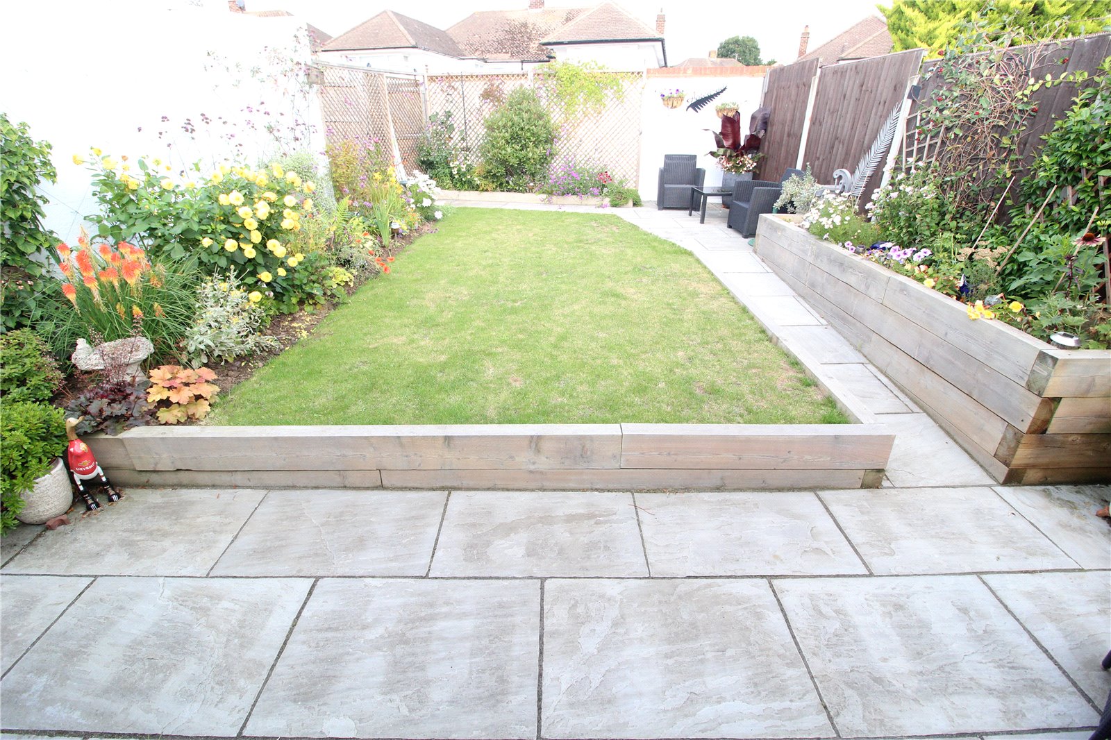 The Rear Garden measures approx. 35ft in depth commencing with a Sandstone paved patio area with railway sleeper borders. Lawned area. Outside water tap and lighting. Side access gate to the front of the property.