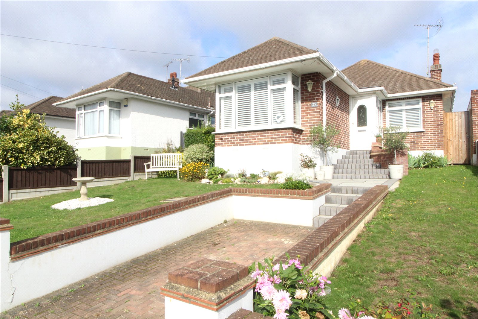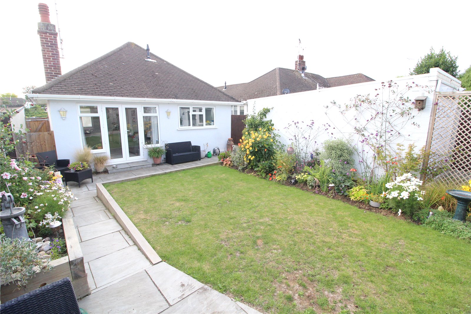 The Front Garden has off street parking. Steps up to the front door. Lawned area with a selection of flower/shrub borders.