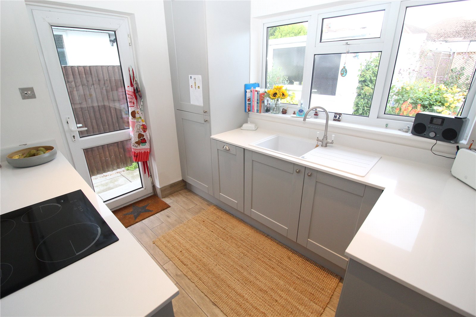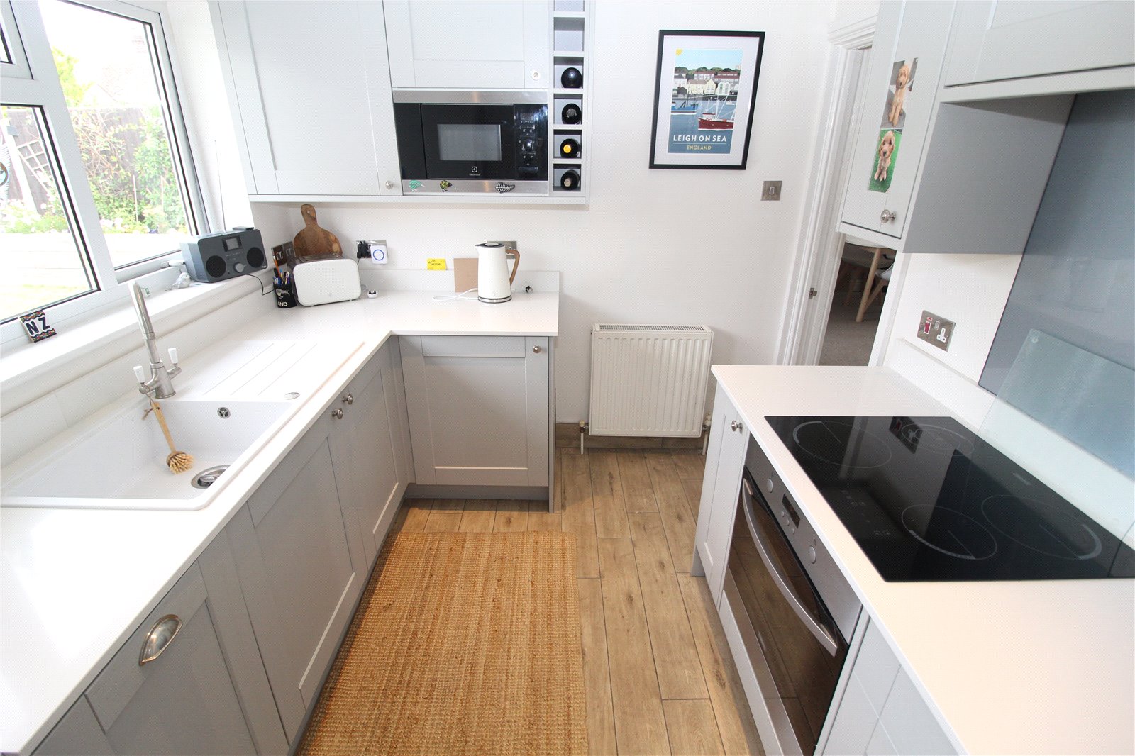 Recently refitted with contemporary style units comprising of base units with quartz worktops incorporating a single drainer sink with mixer taps. Integrated oven and four ring ceramic hob, integrated microwave. Matching wall mounted cupboards. Wine rack. Smooth plastered walls and ceiling with coved cornicing and inset spotlighting. Integrated fridge/freezer. Tiled wood effect flooring. Double radiator. Upvc double glazed window to rear and double glazed door to side.