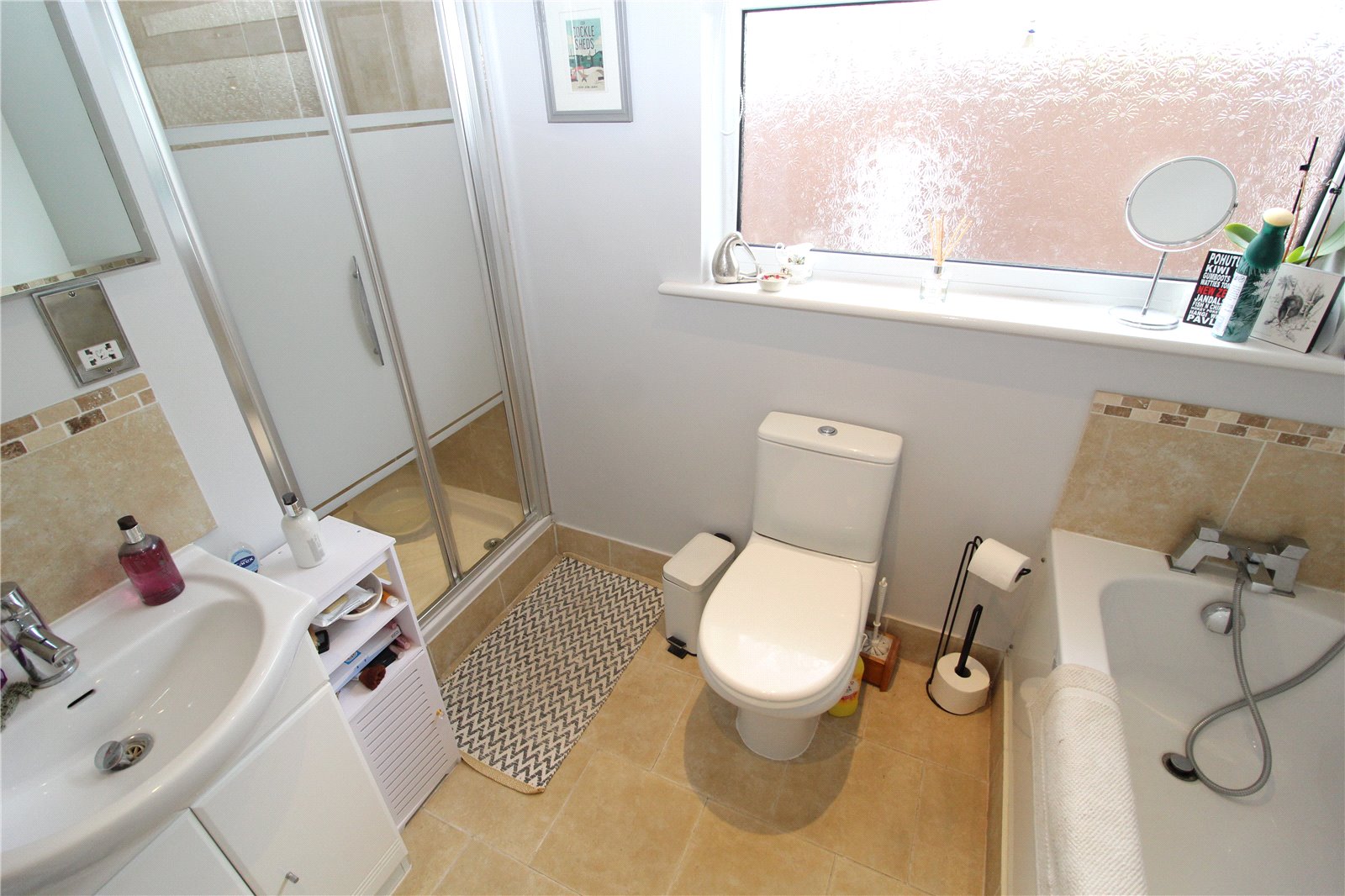 Fitted with a contemporary white four piece suite comprising vanity wash hand basin with stainless steel mixer tap, cupboard under and tiled splashback. Low level w.c., Panelled bath with stainless steel mixer tap and shower attachment. Tiled shower cubicle with wall mounted shower unit. Shaver point. Coved cornicing with smooth plastered walls and ceiling. Ceramic tiled floor. Heated towel rail. Obscure glazed Upvc double glazed window to side. Extractor fan.