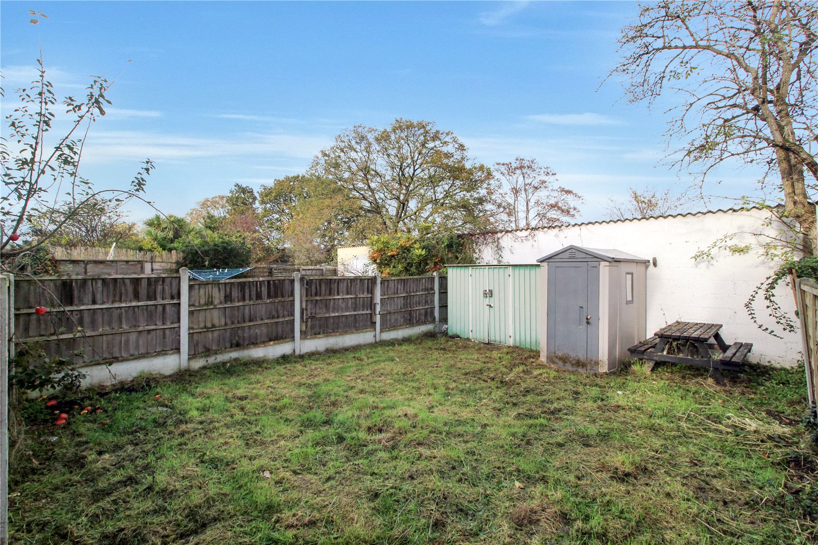 Side passage leading to laid to lawn rear garden with two storage sheds.