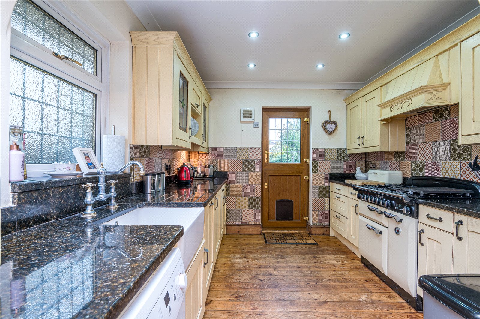 Two opaque upvc double glazed lead light windows to the side aspect and original lead light window adjacent. Upvc double glazed stable door to the rear aspect giving access to the rear garden. The kitchen is fitted with a range of base units with roll edge granite work surfaces incorporating a ''Butler Sink '' with built-in drainer and mixer tap. Further matching wall mounted storage units with glass fronted display doors and plate rack. Integrated dishwasher, fridge and freezer. Space for oven. Space and plumbing for washing machine. Extractor fan. Part tiling to walls. Granite upstand. Double and single banked radiators. Coved cornicing with smooth plastered ceiling and inset spot lighting. Stripped wood floorboards. Airing cupboard housing hot water tank and central heating boiler. Feature fireplace.