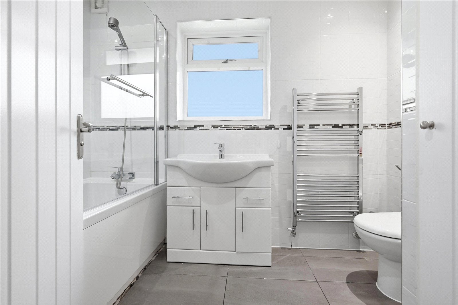 UPVC double obscured glazed window to side. Fitted with a modern three piece suite comprising concealed flush WC, wash basin with mixer tap and storage cupboards and drawers beneath and panelled bath with mixer tap, plus separate adjustable shower attachment, glass shower screen. Chrome heated towel rail. Tiled floors. Fully tiled walls. Storage cupboard to side housing hot water cylinder. Smooth plastered ceiling with recessed LED lighting. Wall mounted extractor fan.
