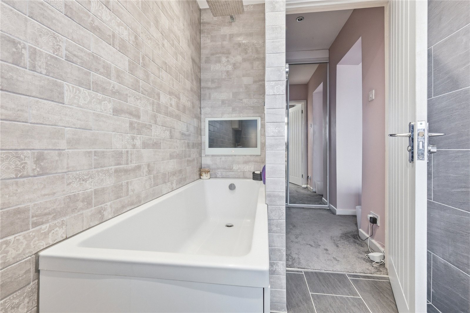 UPVC double obscured glazed window to front. Fitted with a modern three piece comprising low flush WC, wash basin with mixer tap and storage cupboard beneath and panelled bath with wall mounted Aqualisa controls incorporating a rainfall shower attachment. Recessed television and display shelving to side. Chrome heated towel rail. Fully tiled walls. Tiled floor. Smooth plastered ceiling with recessed LED lighting. Wall mounted extractor fan.
