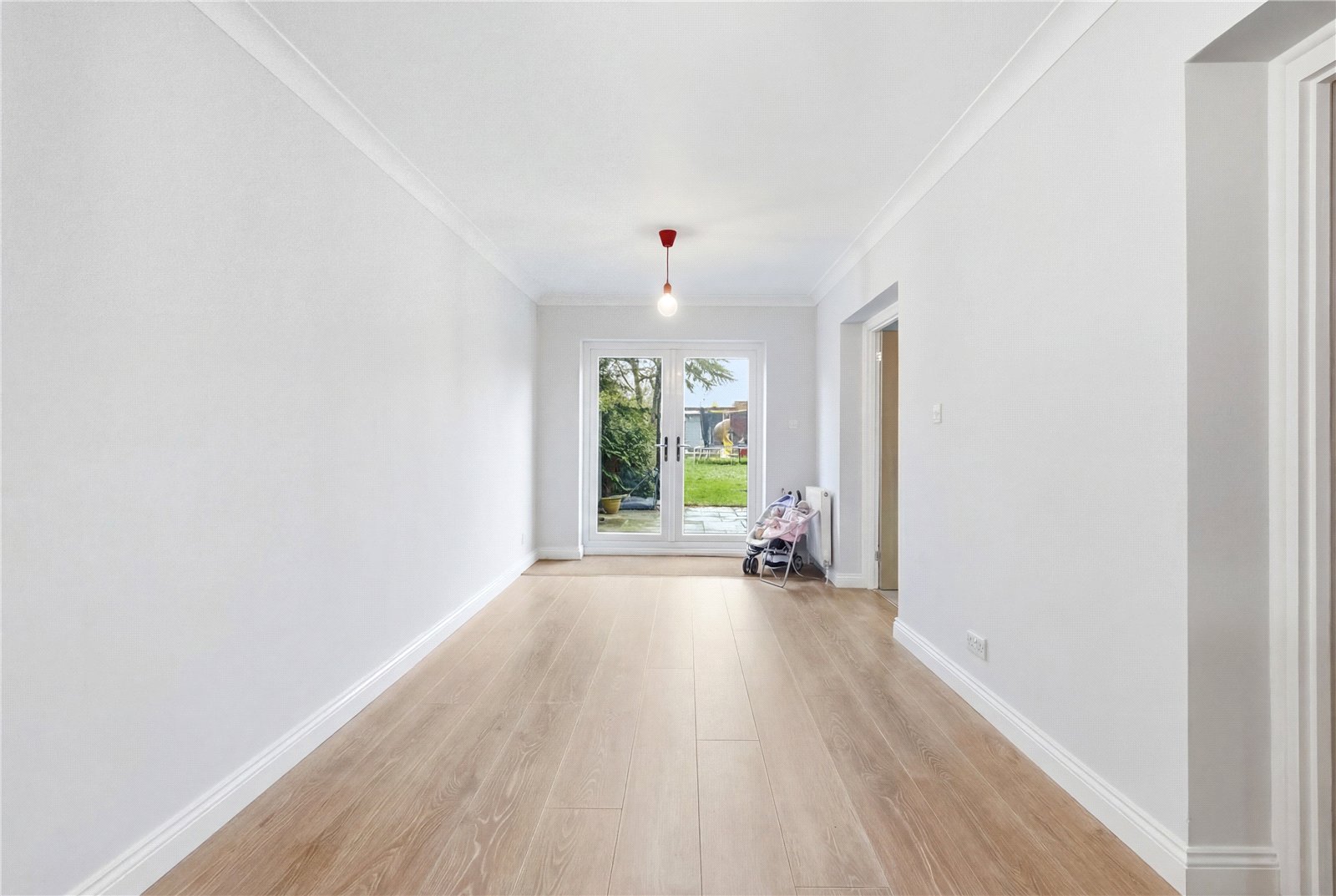 UPVC double glazed French doors to rear leading on to rear garden. Two internal doors to side providing access to lounge/dining room. Two wall mounted radiators. Wood effect laminate flooring. High level skirting. Coved cornice to smooth plastered ceiling.