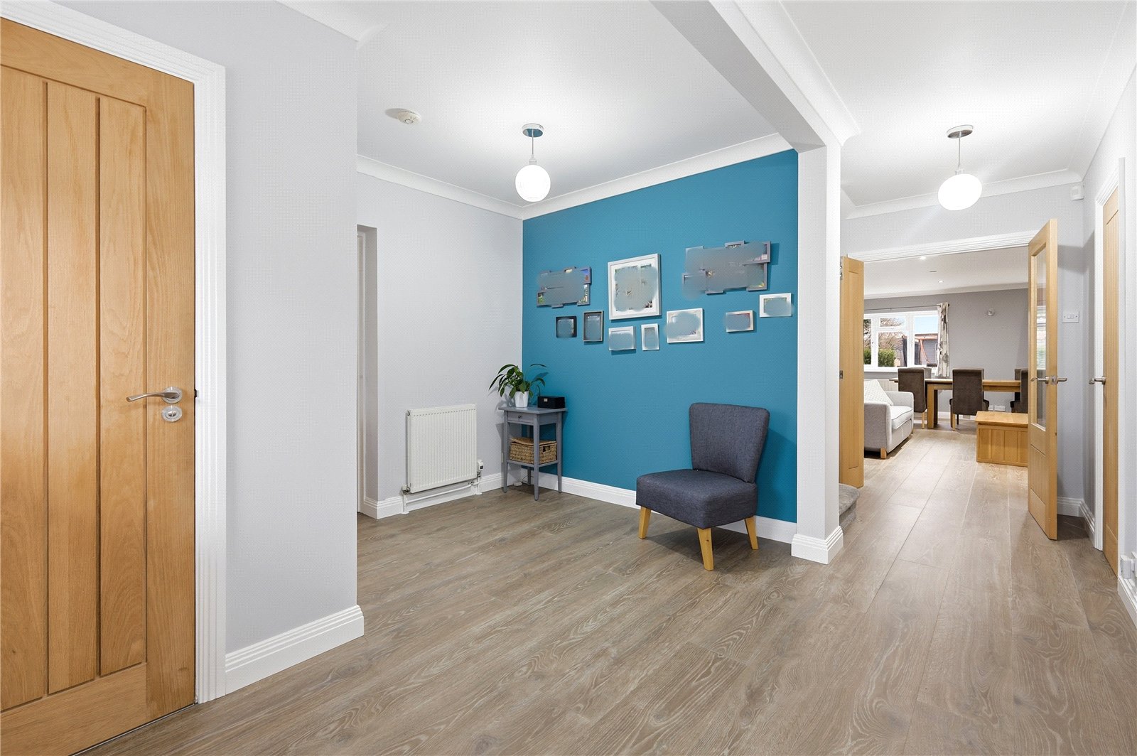 Approached via composite front door with inset obscured glazed panel. UPVC double glazed window adjacent. Doors lead off to ground floor rooms. Stairs rising to first floor accommodation. Two wall mounted radiators. Wood effect laminate flooring. High level skirting. Coved cornice to smooth plastered ceiling. Door to side leading to garage.